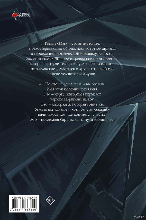 В далёком будущем, где общество превратилось в идеально функционирующую машину, инженер Д-503 начинает испытывать сомнения в безупречности своего упорядоченного мира. Встреча с загадочной I-330 заставляет его бросить вызов устоям общества, подвергая сомнению саму природу разума и свободы. "Мы" – антиутопический роман, который исследует тонкие грани между порядком и хаосом, свободой и контролем, любовью и революцией.