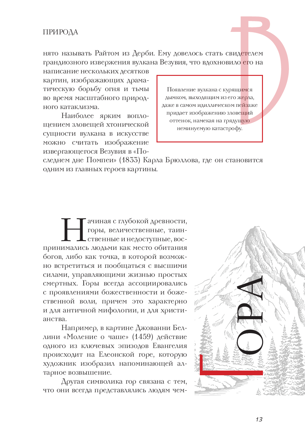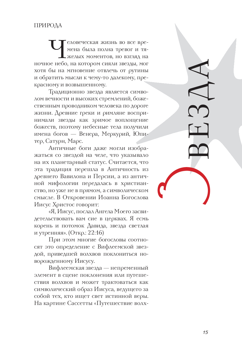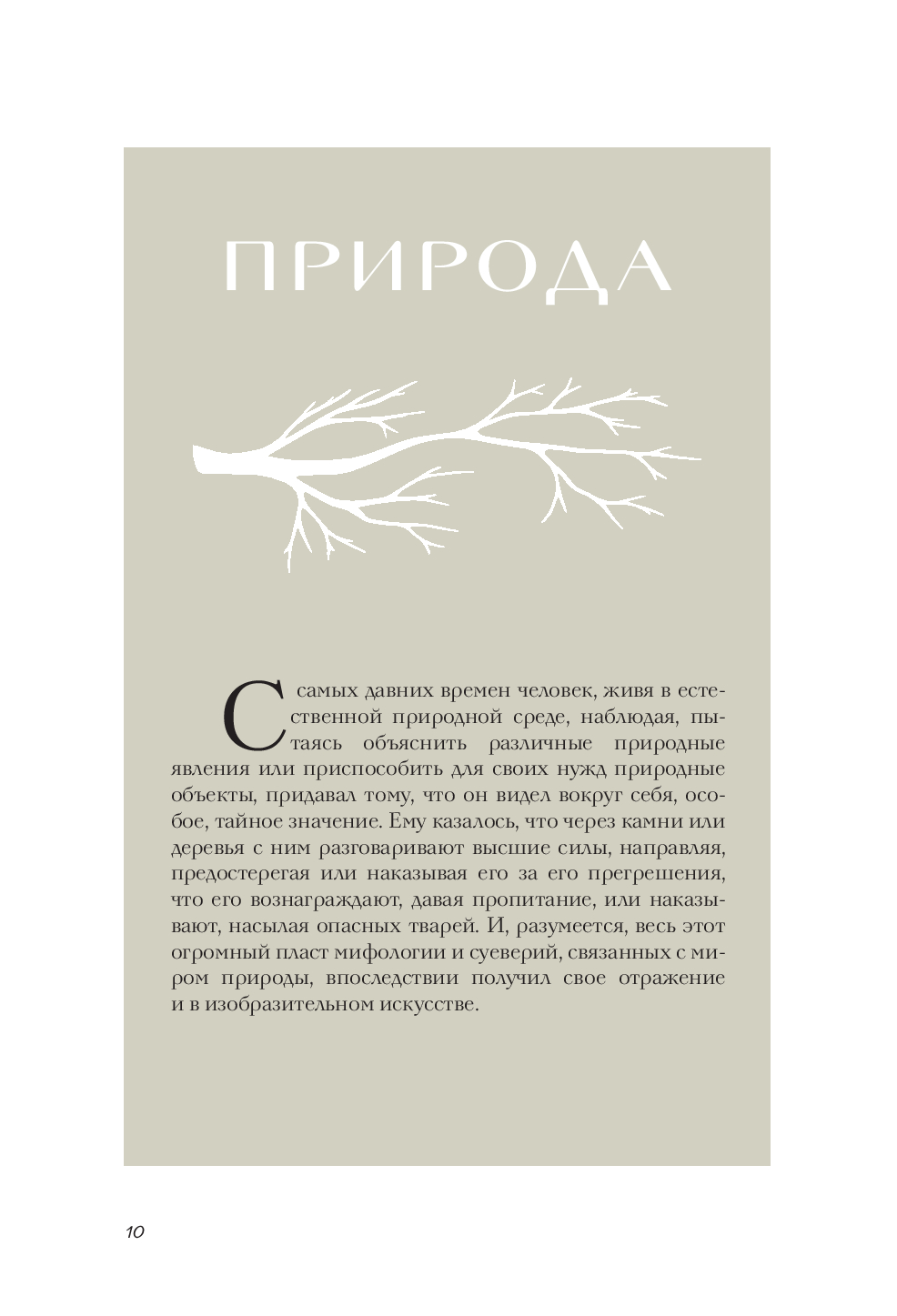 Прекрасно иллюстрированная книга структурирована как словарь, организованный по тематическим группам символов – животным, растениям, природным явлениям и другим мотивам, которые веками использовались художниками в своем творчестве. Здесь раскрывается тайное значение журавля на картине Рафаэля, объясняется, почему Да Винчи написал даму именно с горностаем, и что означает миндаль на знаменитом шедевре Винсента Ван Гога.