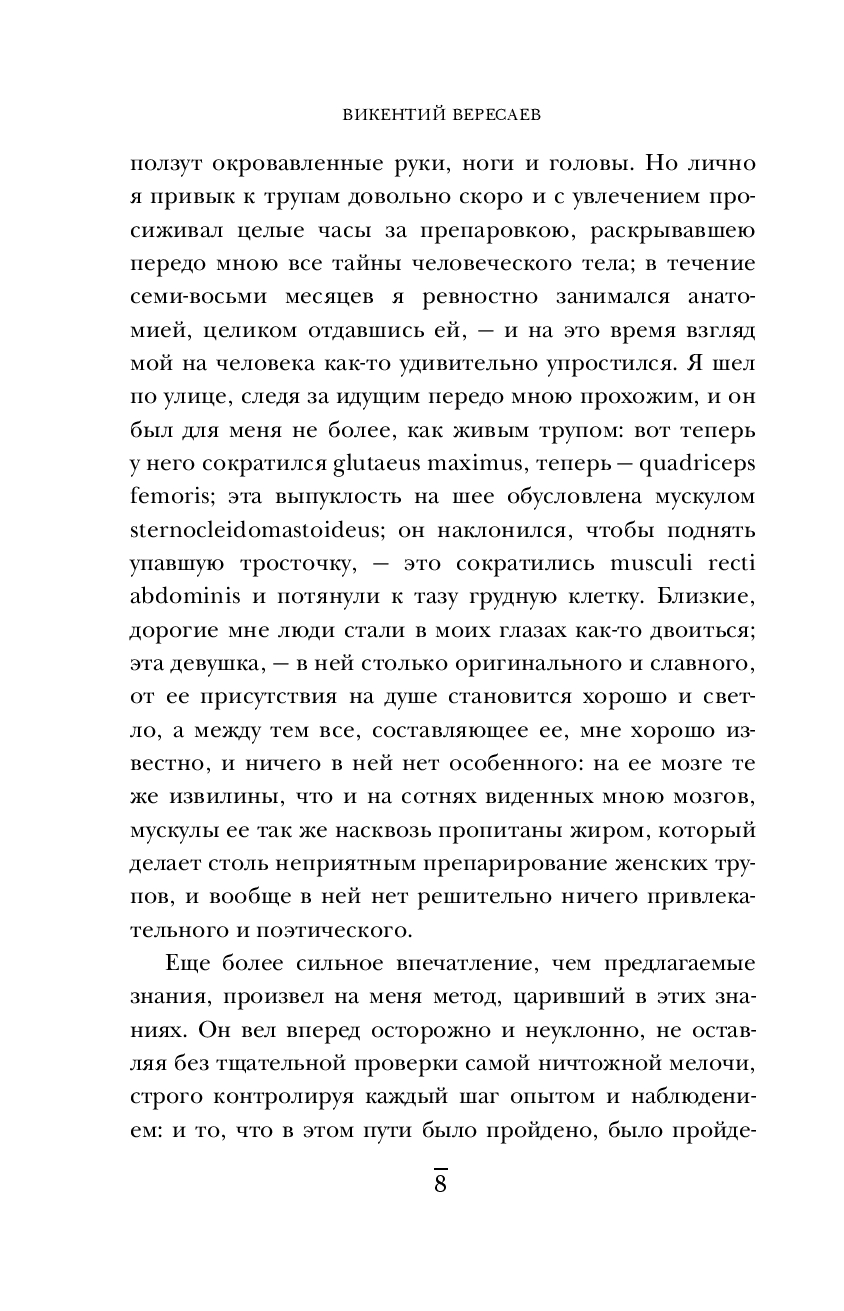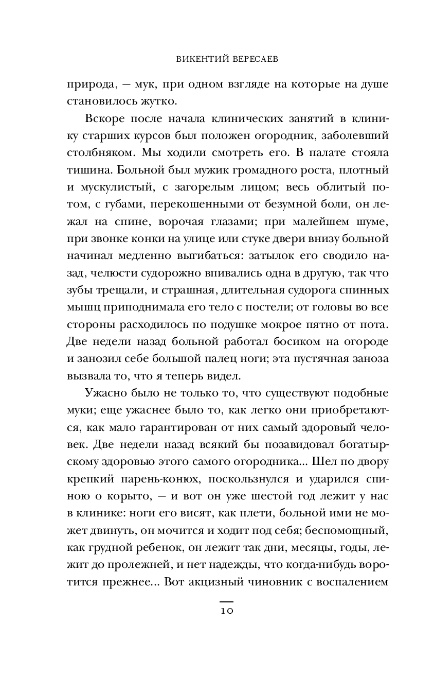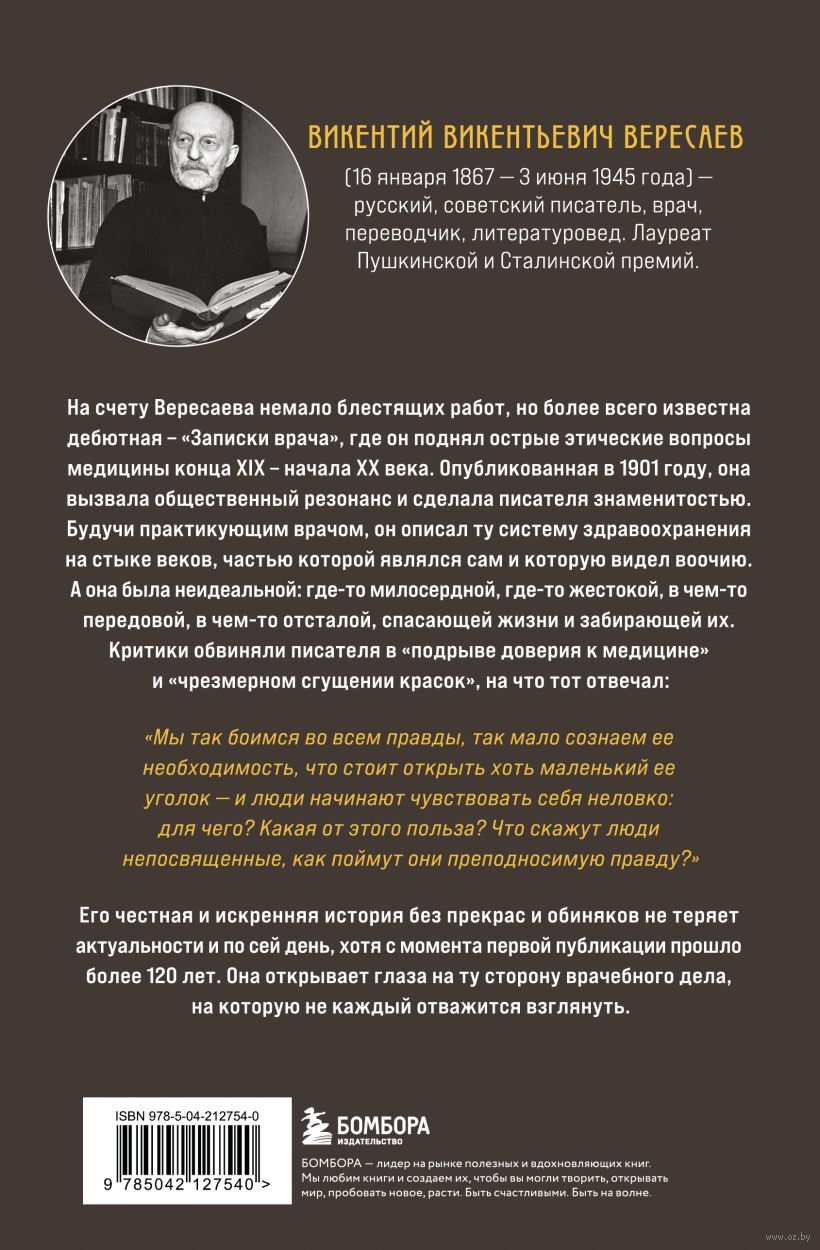 Эта книга – глубокое размышление Викентия Вересаева о его пути от равнодушного студента до страстного врача, стремящегося спасать жизни. На этом пути он сталкивается с этическими вызовами медицинского образования, где обучение часто происходит за счет страданий пациентов, и размышляет о моральных дилеммах, связанных с медицинской практикой и экспериментами. Он делится своими переживаниями о недостатках науки, сложностях практического применения знаний, а также поднимает вопрос необходимости баланса между инновациями и безопасностью. Согласитесь, звучит довольно современно? И действительно, в книге, написанной больше века назад, освещаются многие вопросы, находящиеся на повестке дня у медицинского сообщества и по сей день. Конечно, сейчас медицина стала доступнее, а инструменты совершеннее, но глубокие философские вопросы Вересаева, обращенные к самому себе и всем, кто давал клятву Гиппократа, все так же заставляют задуматься.