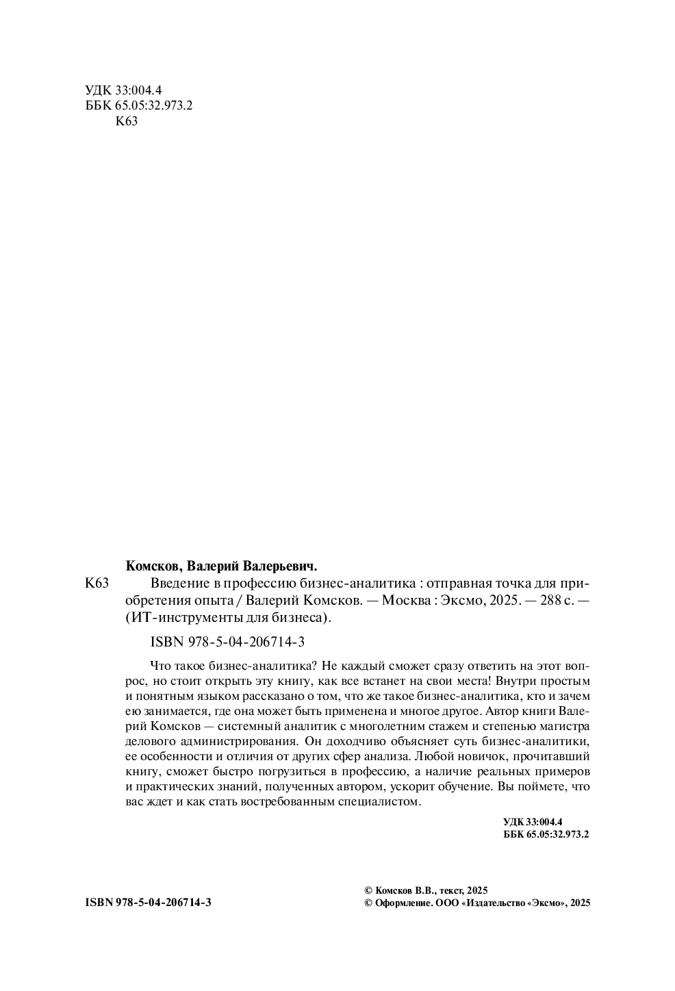 Что такое бизнес-аналитика? Не каждый сможет сразу ответить на этот вопрос, но стоит открыть эту книгу, как все встанет на свои места! Внутри простым и понятным языком рассказано о том, что же такое бизнес-аналитика, кто и зачем ею занимается, где она может быть применена и многое другое. Автор книги Валерий Комсков – системный аналитик с многолетним стажем и степенью магистра делового администрирования. Он доходчиво объясняет суть бизнес-аналитики, ее особенности и отличия от других сфер анализа. Любой новичок, прочитавший книгу, сможет быстро погрузиться в профессию, а наличие реальных примеров и практических знаний, полученных автором, ускорит обучение. Вы поймете, что вас ждет и как стать востребованным специалистом.