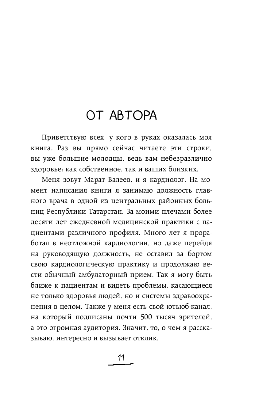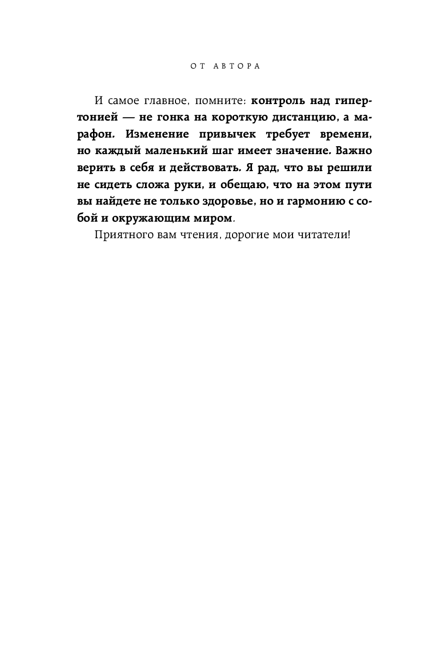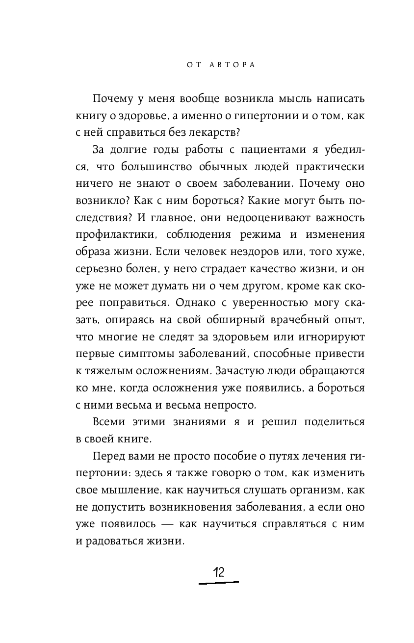 В то же время книга не ограничивается одной лишь теорией. Марат Валеев как никто другой знает о необходимости сочетания теории с практикой, поэтому не оставит своих читателей без практических рекомендаций, благодаря которым любой сможет гарантированно и без особого труда привести своё здоровье в порядок вне зависимости от возраста и тяжести заболевания. Автор поможет грамотно сформировать и закрепить здоровые привычки, составить полезный рацион на каждый день и подберет простые, но действенные физические упражнения, с которыми справятся не только молодые, но и пожилые гипертоники.