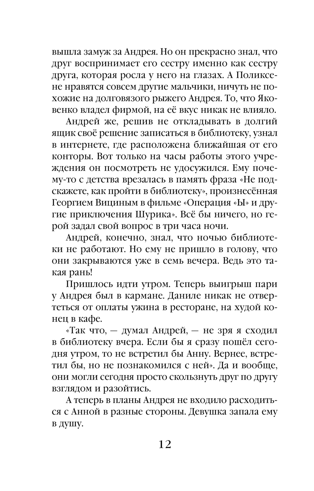 Записаться в районную библиотеку? Легко! Поспорив с лучшим другом, Андрей не только выиграл пари, но и обрел свое счастье – познакомился с очаровательной и скромной Аней. Молодые люди решили пожениться, однако неожиданное убийство жениха переворачивает все с ног на голову. Сестра главного подозреваемого обращается за помощью к Андриане Карлсоновне, энергичной владелице детективного агентства "Шведское варенье", чтобы найти настоящего убийцу. Сможет ли обаятельная старушка разыскать злодея, если ни у кого из знакомых убитого не было мотива для преступления?