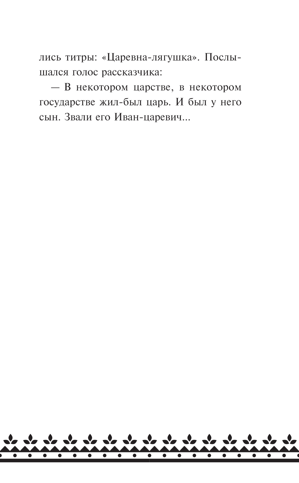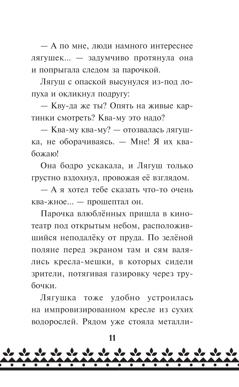 Уютный парк с летним кинотеатром полюбился не только горожанам, но и очаровательной лягушке в пруду. Ещё бы, с её кувшинки можно смотреть разные живые картинки! Сегодня на экране показывали хорошо знакомую людям историю: Иван-царевич по наказу своего отца отправился искать невесту. Выпустил он стрелу из лука, и угодила она прямиком в болото, где её поймала лягушка. Нашел Иван-царевич свою стрелу, забрал лягушку к себе домой, снял колдовские чары, и превратилась она в прекрасную девушку…