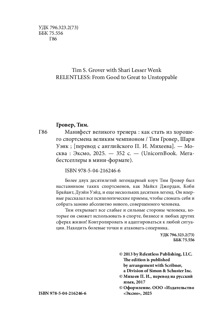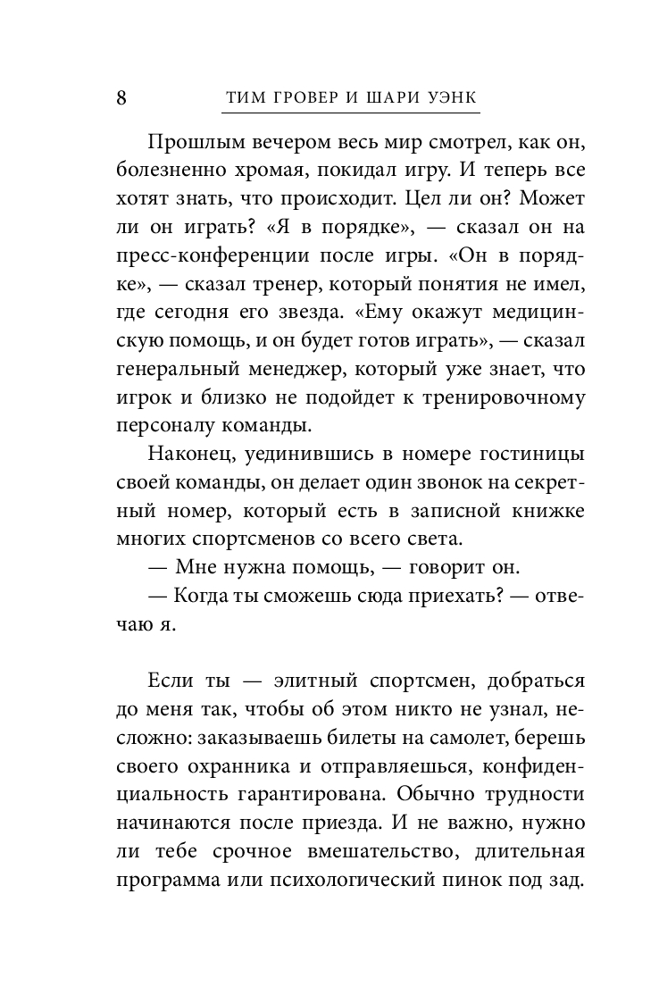Более двух десятилетий легендарный коуч Тим Гровер был наставником таких спортсменов, как Майкл Джордан, Коби Брайант, Дуэйн Уэйд, и еще нескольких десятков легенд. Он впервые рассказал все психологические приемы, чтобы сломать себя и собрать заново абсолютно нового, совершенного человека.