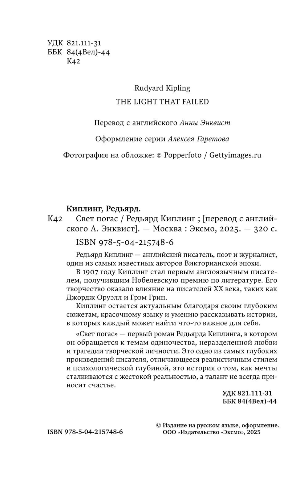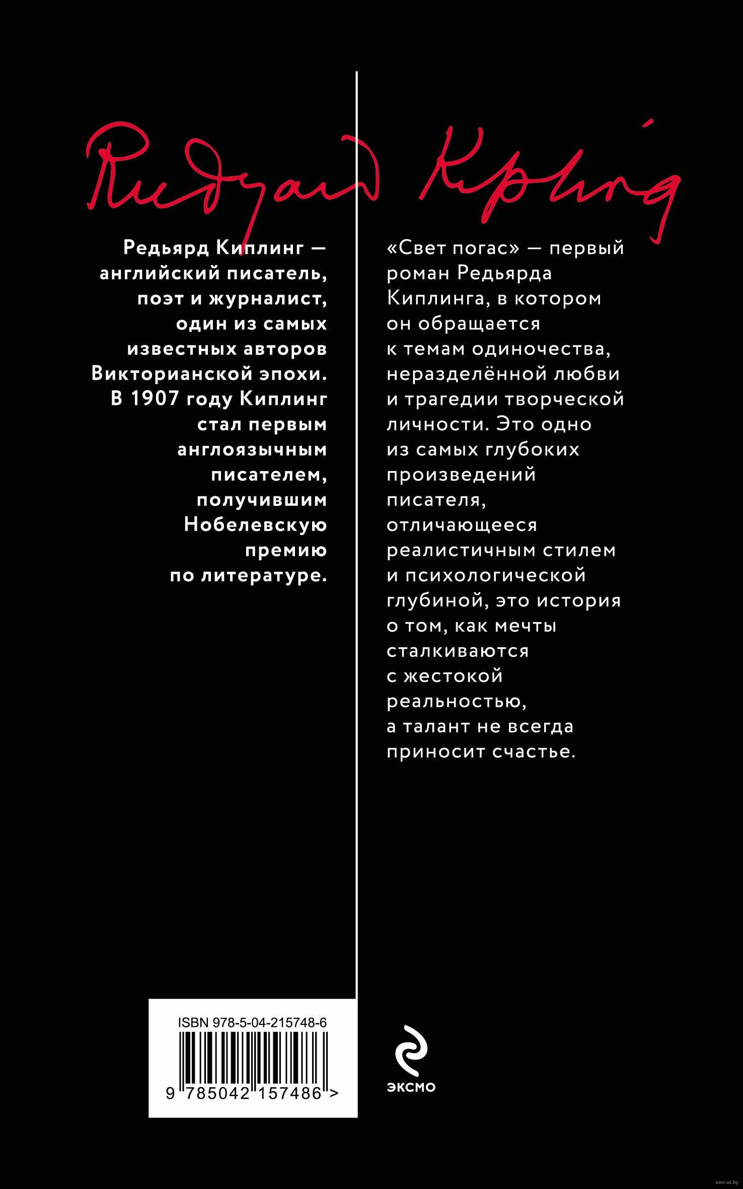 "Свет погас" – первый роман Редьярда Киплинга, в котором он обращается к темам одиночества, неразделённой любви и трагедии творческой личности. Это одно из самых глубоких произведений писателя, отличающееся реалистичным стилем и психологической глубиной – это история о том, как мечты сталкиваются с жестокой реальностью, а талант не всегда приносит счастье.