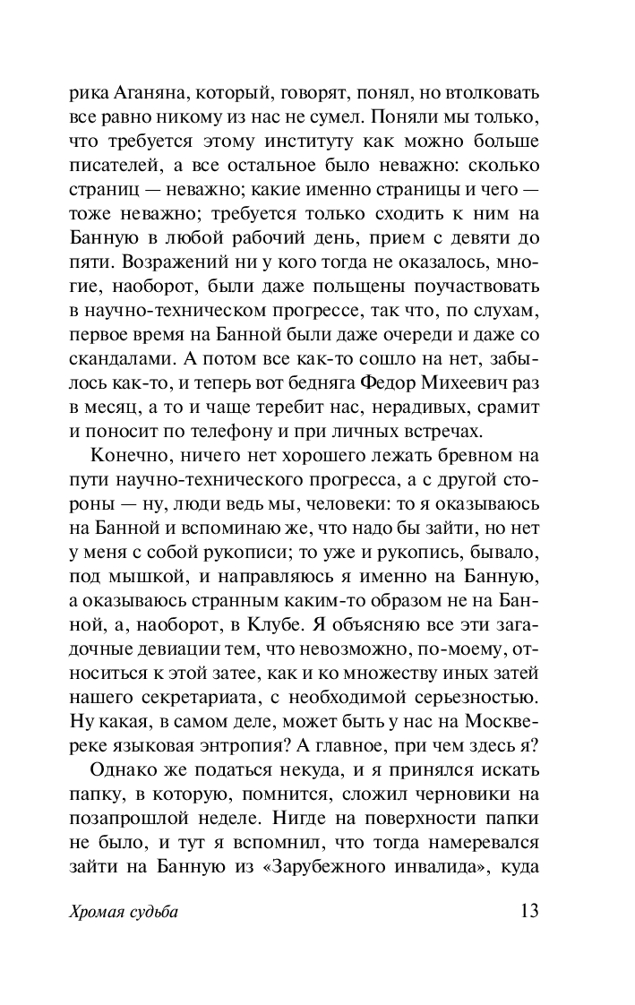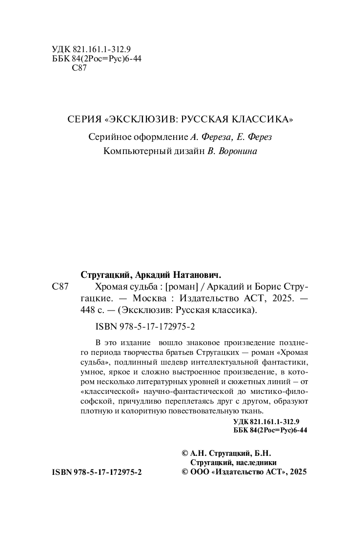 В это издание вошло знаковое произведение позднего периода творчества братьев Стругацких – роман "Хромая судьба", подлинный шедевр интеллектуальной фантастики, умное, яркое и сложно выстроенное произведение, в котором несколько литературных уровней и сюжетных линий – от "классической" научно-фантастической до мистико-философской, причудливо переплетаясь друг с другом, образуют плотную и колоритную повествовательную ткань.