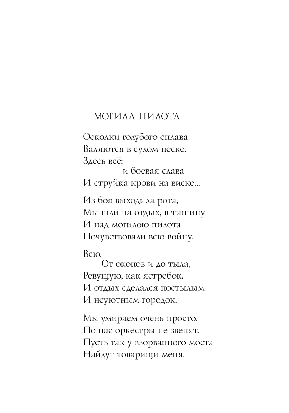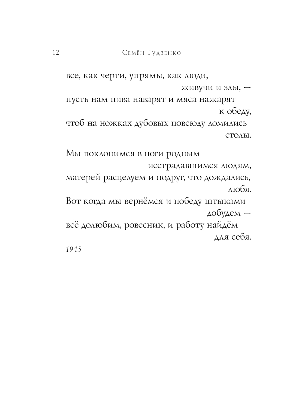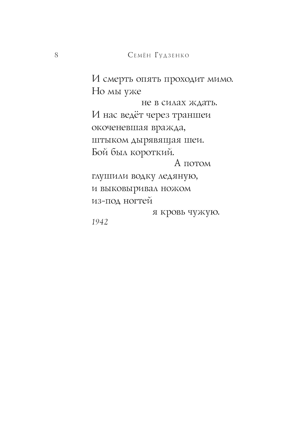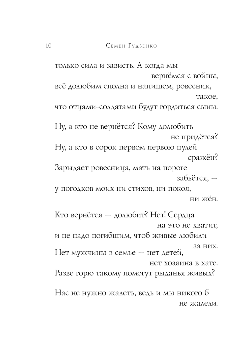 В своих стихах Семён Гудзенко, будучи участником Великой Отечественной войны, через призму личных переживаний смог запечатлеть страшную трагедию... Его поэзия – лирический манифест, обращённый к человеческому сердцу. Рисуя мир солдатской жизни, где страшные и героические моменты сплетаются воедино, поэт создаёт образ целого поколения, мужественно защищавшего свою родину. Стихи Гудзенко важны как историческое свидетельство и напоминание нам о вере в особые ценности, позволяющей преодолеть любые трудности.