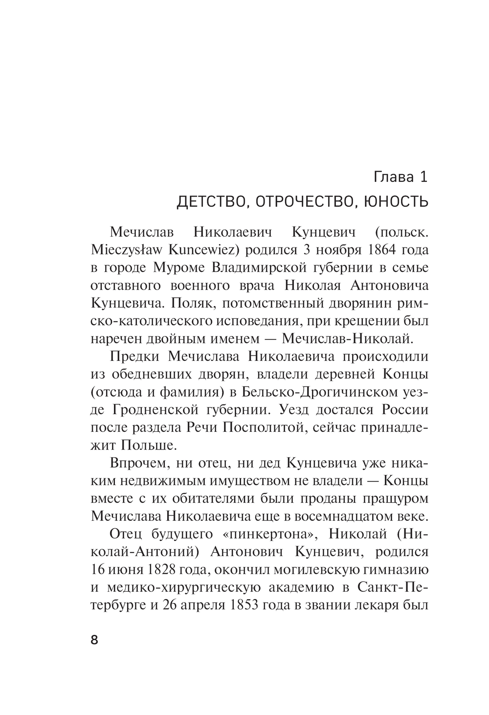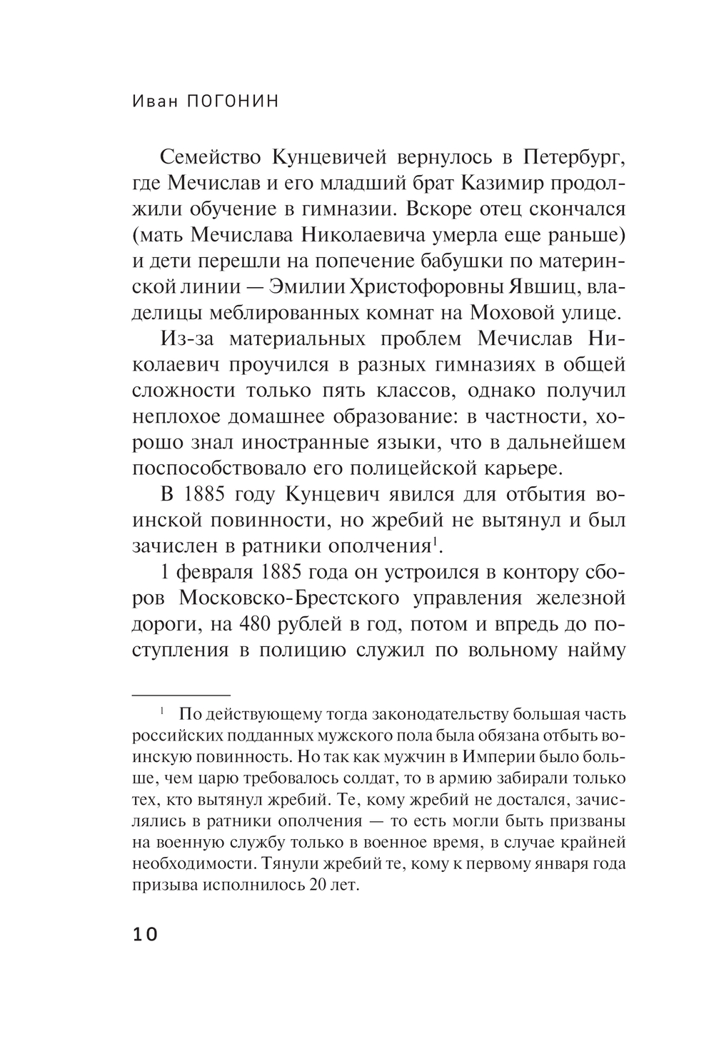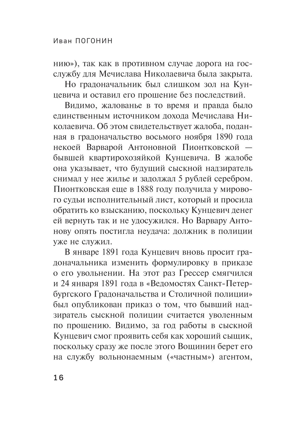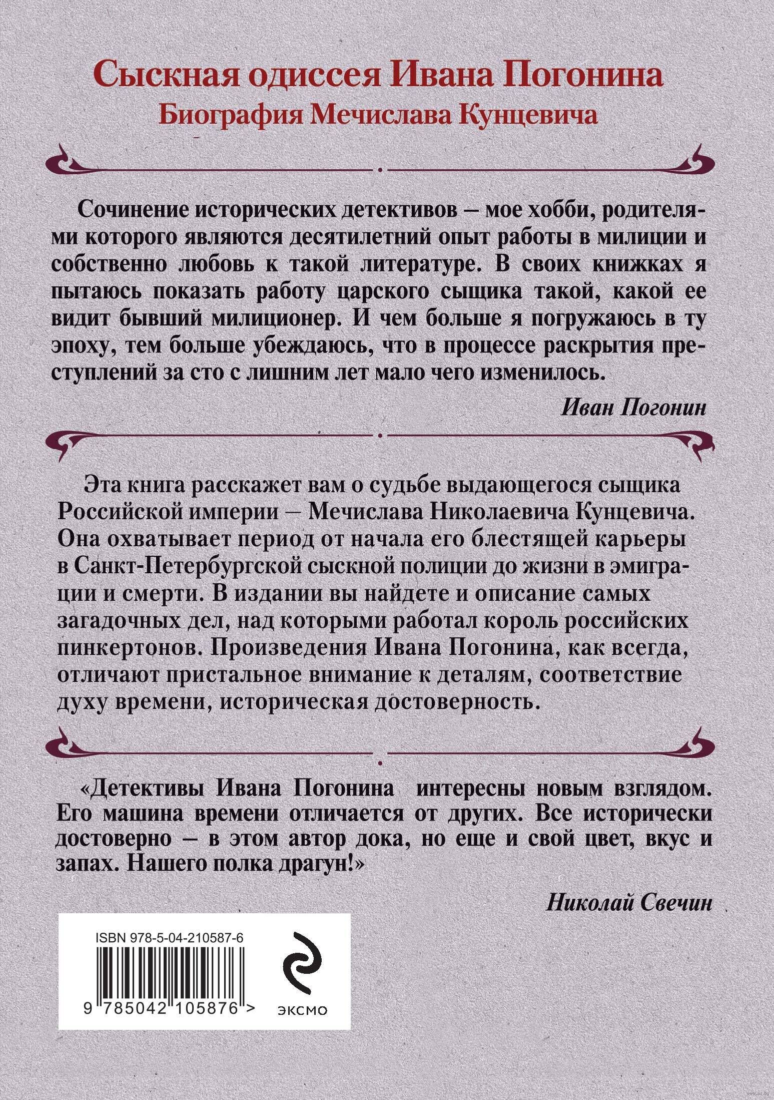Эта книга расскажет вам о судьбе выдающегося сыщика Российской империи – Мечислава Николаевича Кунцевича. Она охватывает период от начала его блестящей карьеры в Санкт-Петербургской сыскной полиции до жизни в эмиграции и смерти. В издании вы найдете и описание самых загадочных дел, над которыми работал король российских пинкертонов. Произведения Ивана Погонина, как всегда, отличают пристальное внимание к деталям, соответствие духу времени, историческая достоверность.