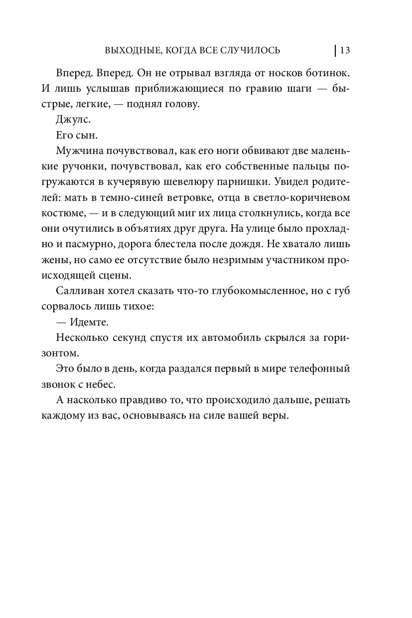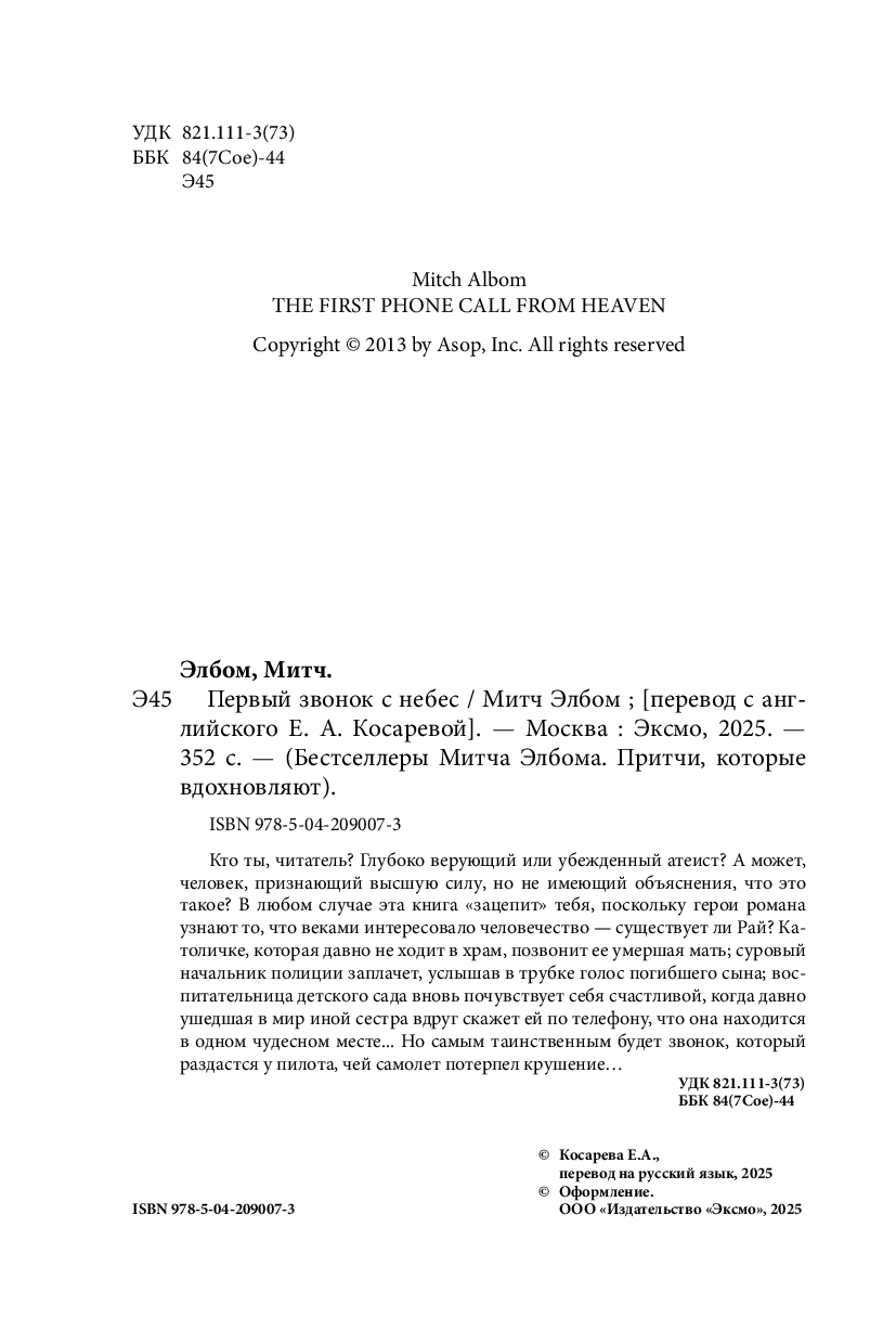 Кто ты, читатель? Глубоко верующий или убежденный атеист? А может, человек, признающий высшую силу, но не имеющий объяснения, что это такое? В любом случае, эта книга "зацепит" тебя, поскольку герои романа узнают то, что веками интересовало человечество – существует ли Рай? Католичке, которая давно не ходит в храм, позвонит ее умершая мать; суровый начальник полиции заплачет, услышав в трубке голос погибшего сына; воспитательница детского сада вновь почувствует себя счастливой, когда давно ушедшая в мир иной сестра вдруг скажет ей по телефону, что она находится в одном чудесном месте... Но самым таинственным будет звонок, который раздастся у пилота, чей самолет потерпел крушение…