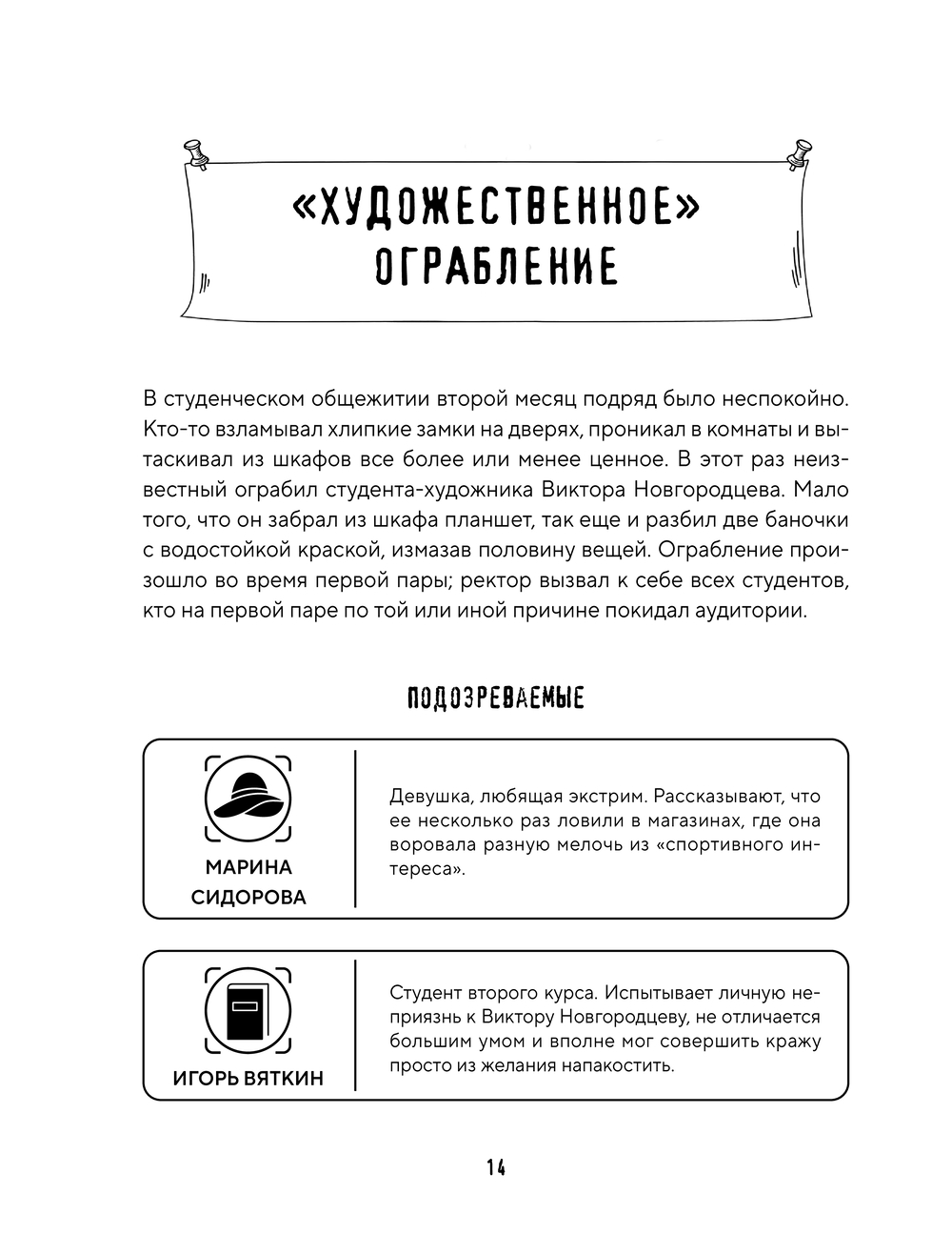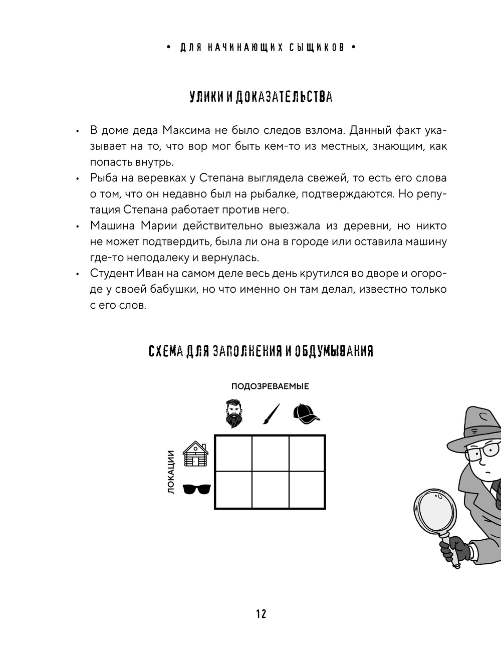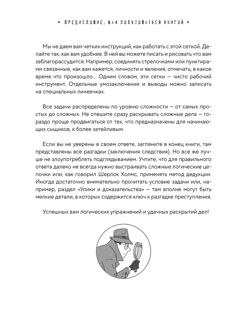 С этой книгой вы сможете примерить на себя роль настоящего сыщика! В ней собраны самые разные детективные задачки, начиная от кражи денег и заканчивая жутким убийством. Вас ждёт 40 головоломок любого уровня сложности: их будет под силу разгадать как начинающим детективам, так и специалистам высшей категории.