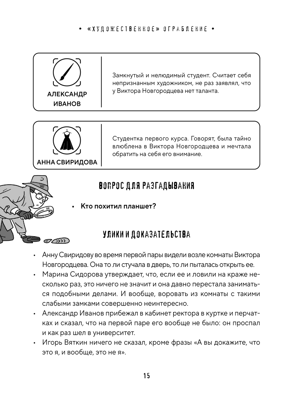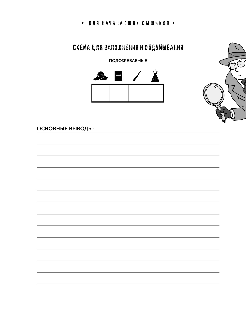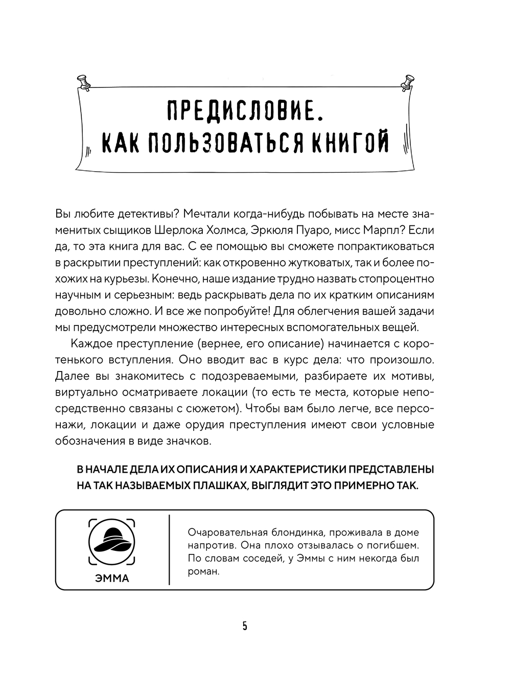 С этой книгой вы сможете примерить на себя роль настоящего сыщика! В ней собраны самые разные детективные задачки, начиная от кражи денег и заканчивая жутким убийством. Вас ждёт 40 головоломок любого уровня сложности: их будет под силу разгадать как начинающим детективам, так и специалистам высшей категории.