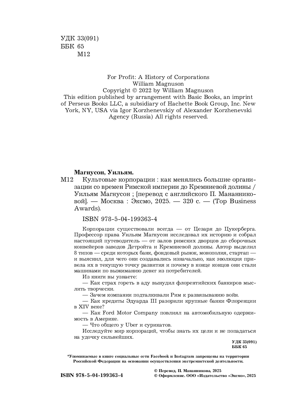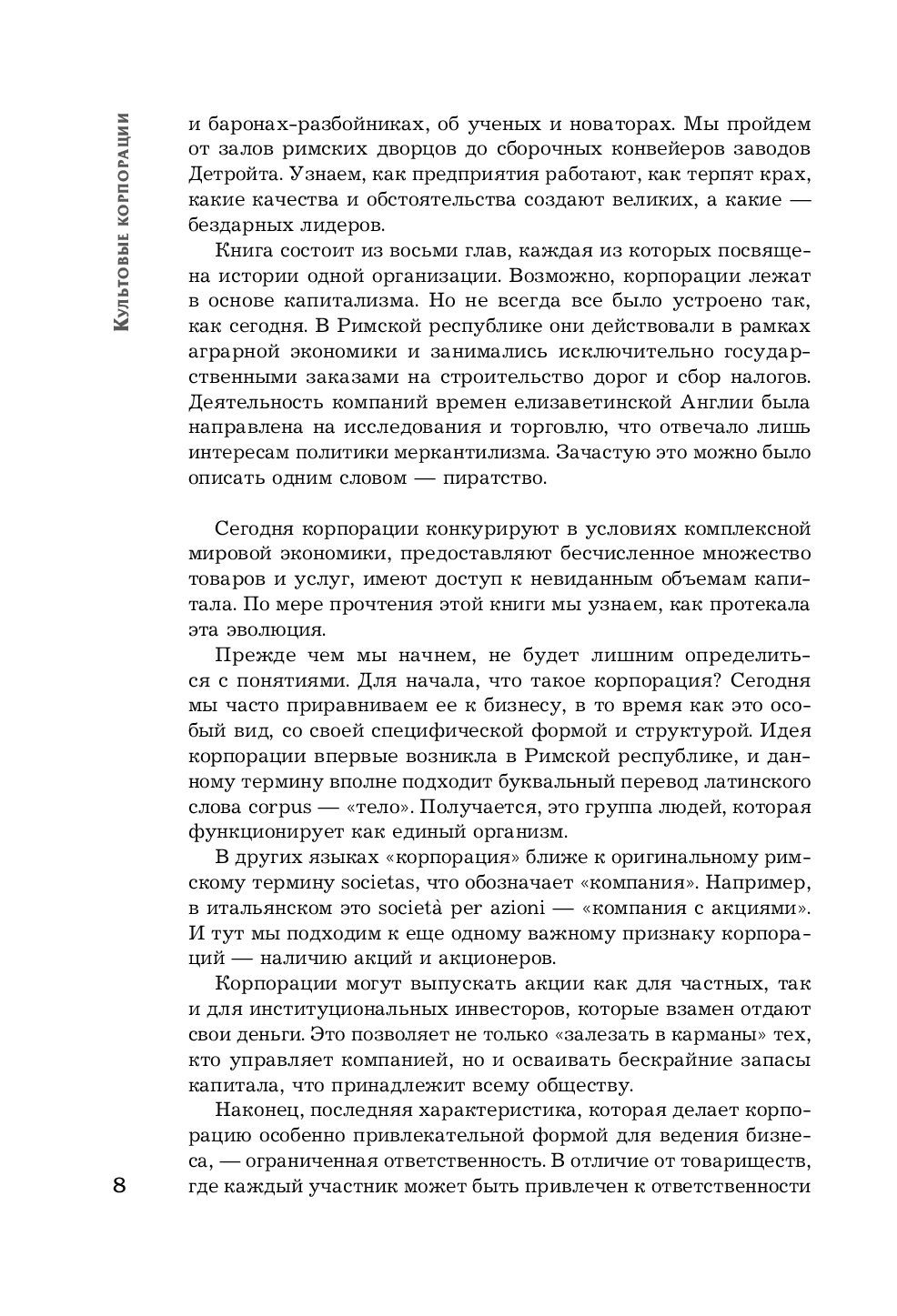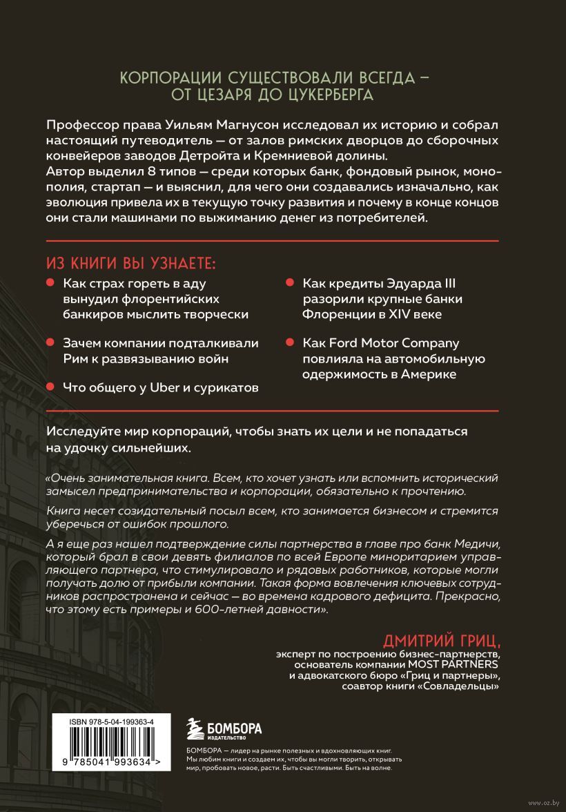 Корпорации существовали всегда – от Цезаря до Цукерберга. Профессор права Уильям Магнусон исследовал их историю и собрал настоящий путеводитель – от залов римских дворцов до сборочных конвейеров заводов Детройта и Кремниевой Долины. Автор выделил 8 типов – среди которых банк, фондовый рынок, монополия, стартап – и выяснил: для чего они создавались изначально, как эволюция привела их в текущую точку развития и почему в конце концов они стали машинами по выжиманию денег из потребителей.