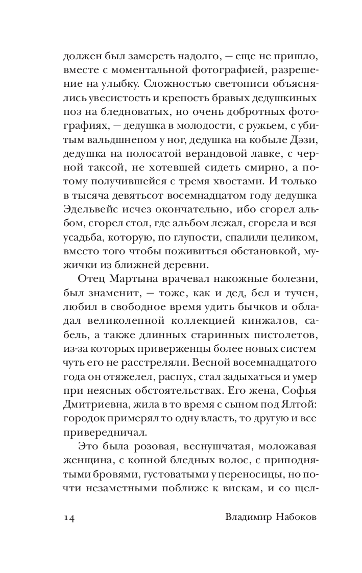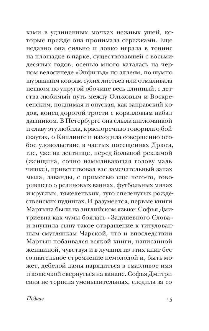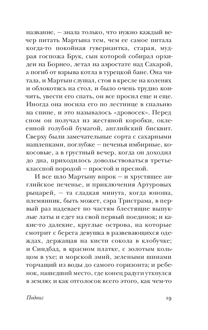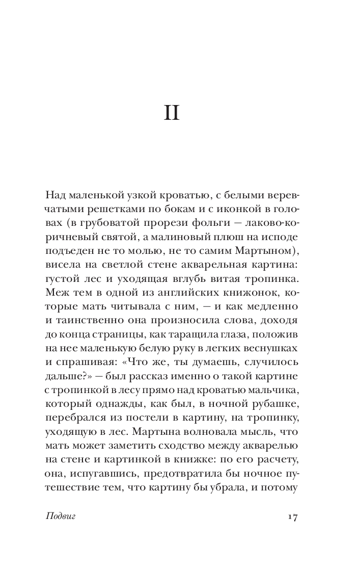 "Подвиг" (1931), четвертый роман Владимира Набокова, написанный в Берлине, представляет собой новый взгляд на классический "роман воспитания". Набоков наделяет своего трогательного героя некоторыми собственными чертами и обстоятельствами, в то же время делая его человеком, далеким от литературы. Выпускник Кембриджа с цветочным именем Мартын Эдельвейс, русский эмигрант, мечтает совершить что‑то исключительное. Он путешествует по Европе и тщетно ищет применения своим способностям. Никогда не оставлявшее его смутное стремление постепенно обретает очертания, и он решается на подвиг, подобный мифическому сошествию в Аид, – перейти границу возможного и вернуться в собственное русское детство.