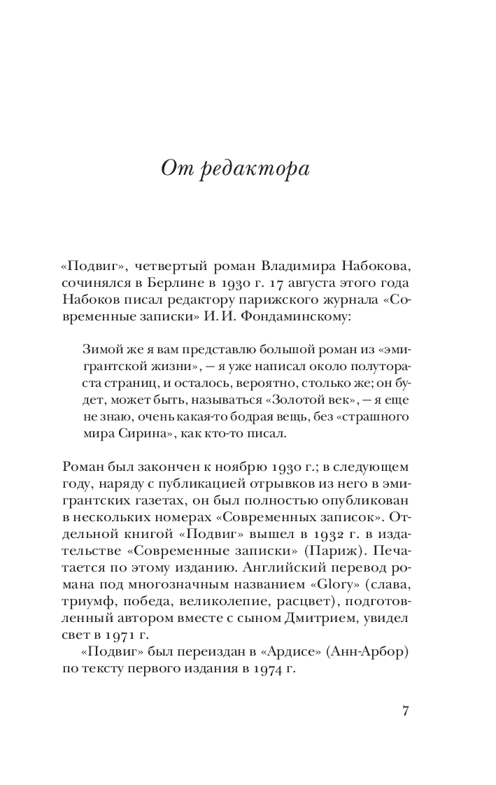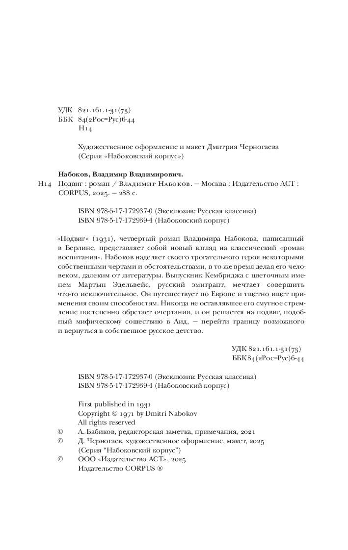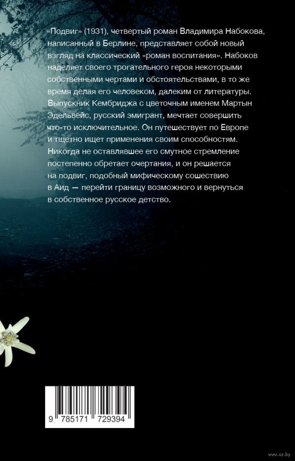 "Подвиг" (1931), четвертый роман Владимира Набокова, написанный в Берлине, представляет собой новый взгляд на классический "роман воспитания". Набоков наделяет своего трогательного героя некоторыми собственными чертами и обстоятельствами, в то же время делая его человеком, далеким от литературы. Выпускник Кембриджа с цветочным именем Мартын Эдельвейс, русский эмигрант, мечтает совершить что‑то исключительное. Он путешествует по Европе и тщетно ищет применения своим способностям. Никогда не оставлявшее его смутное стремление постепенно обретает очертания, и он решается на подвиг, подобный мифическому сошествию в Аид, – перейти границу возможного и вернуться в собственное русское детство.