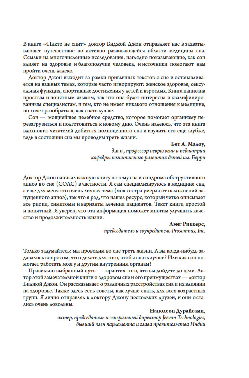 Доктор Биджой Джон подчеркивает, что расстройство сна часто связано с психологическими проблемами, такими как тревожность, депрессия и зависимость. Книга предлагает исчерпывающее пошаговое руководство, которое поможет понять: требуется им незначительная корректировка своих привычек сна или полная перестройка.