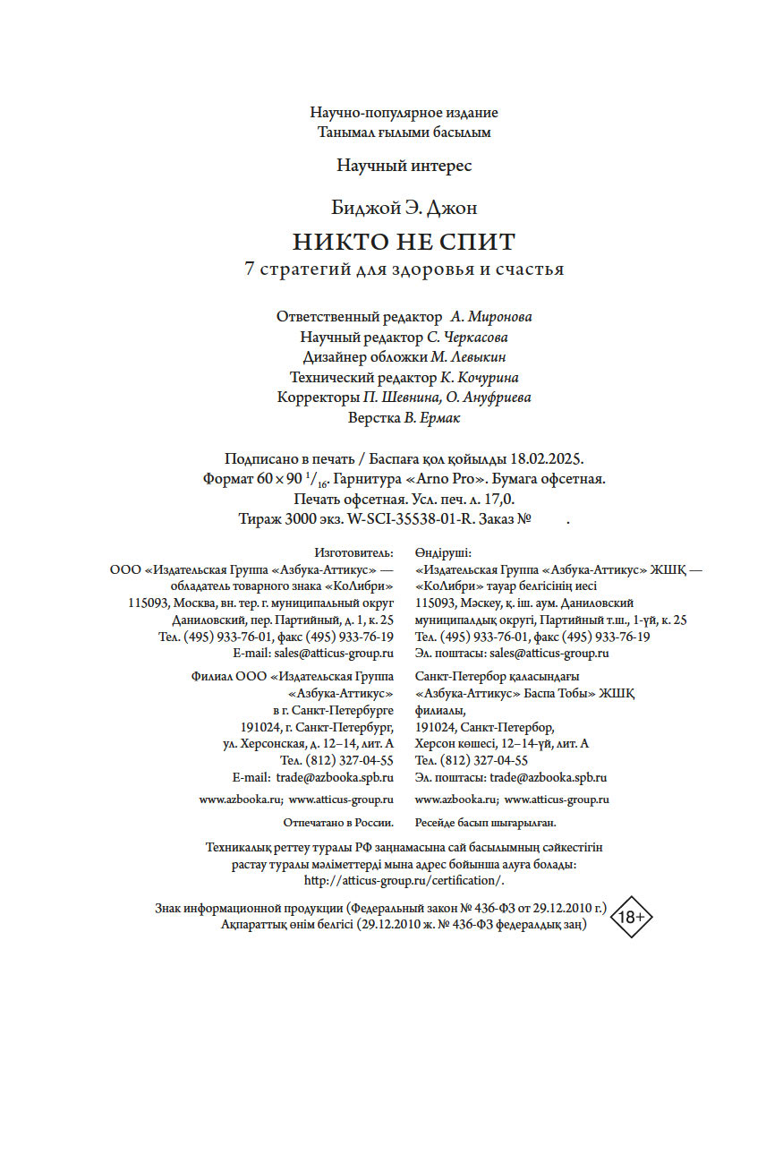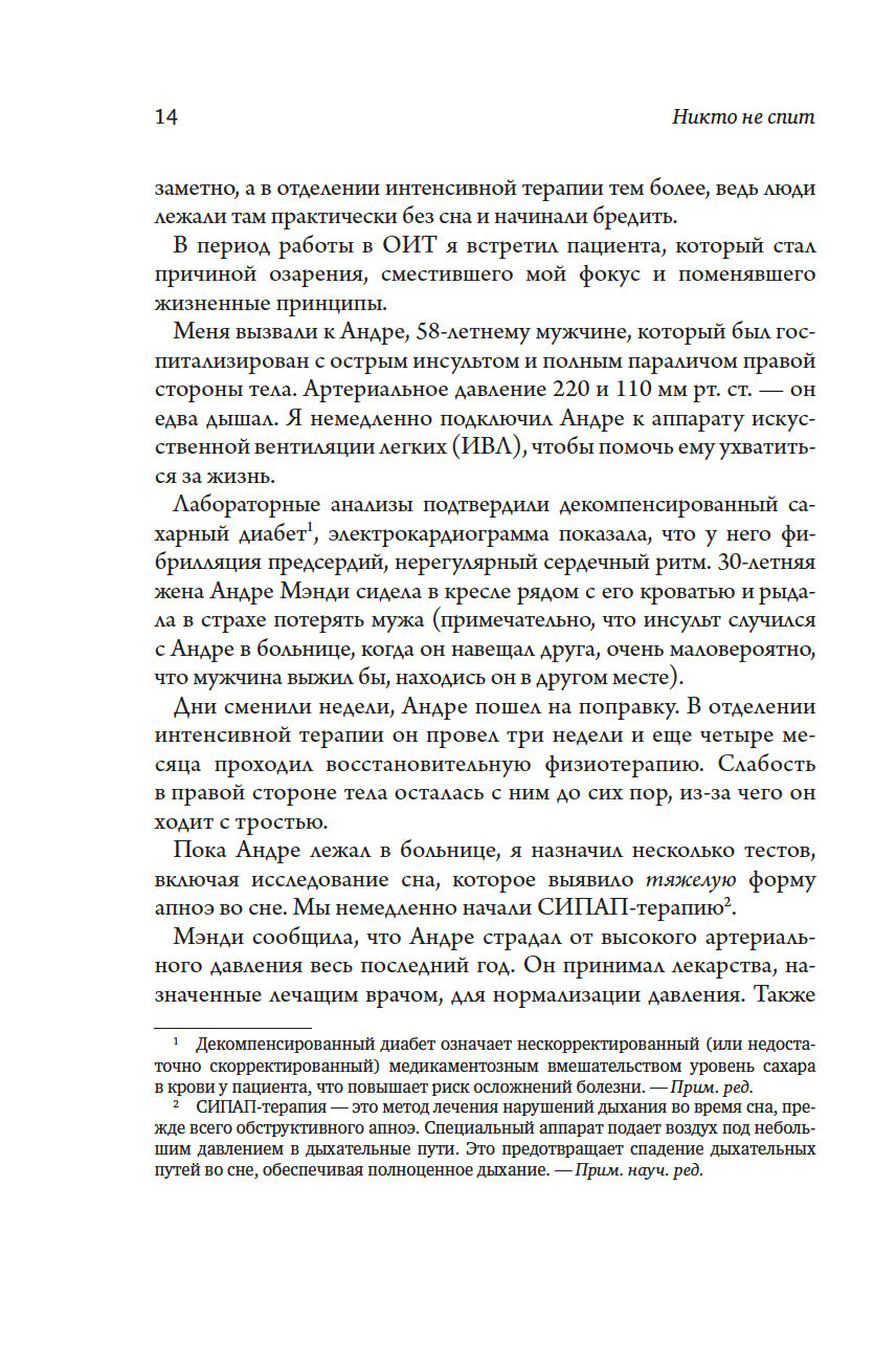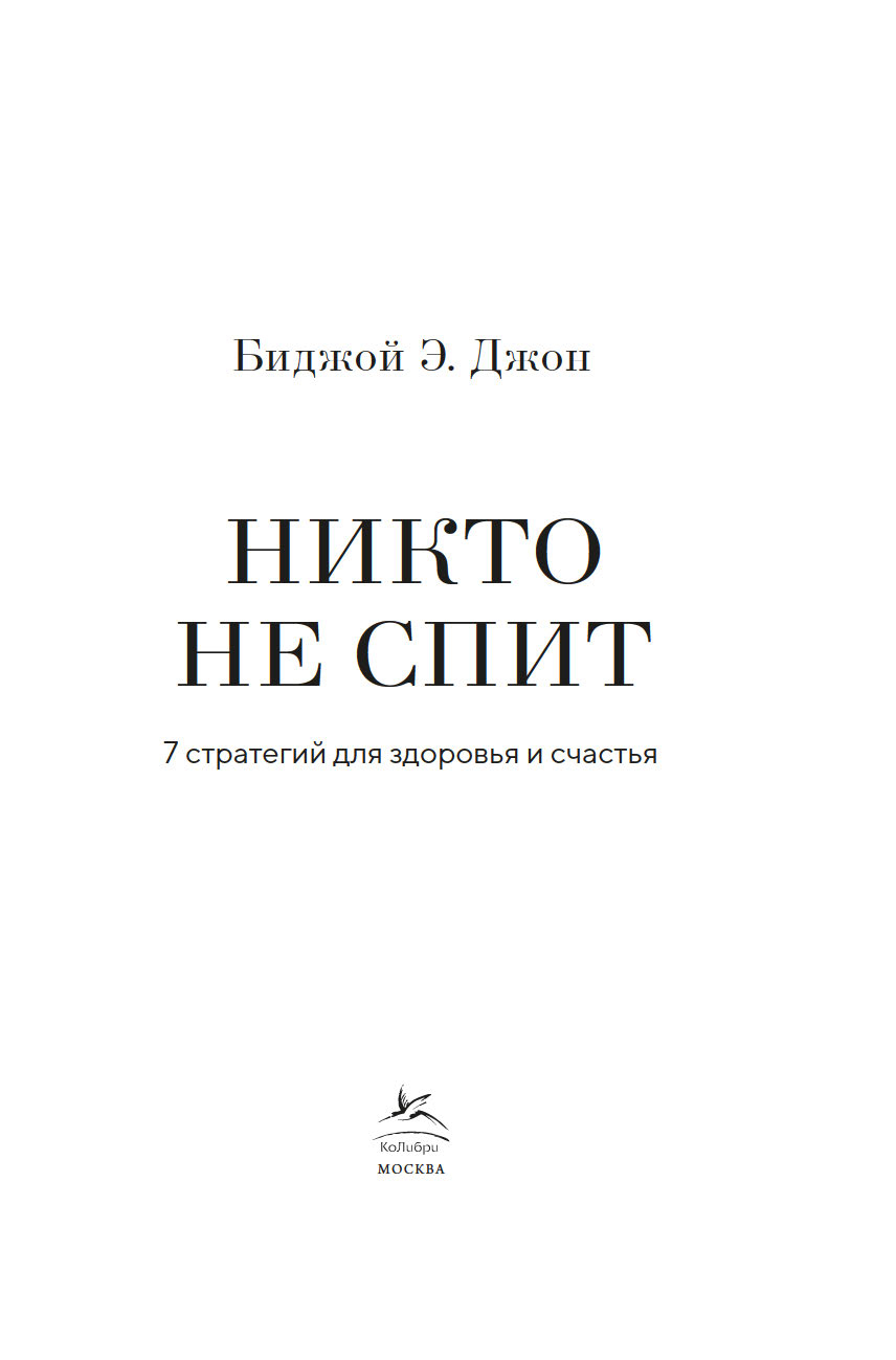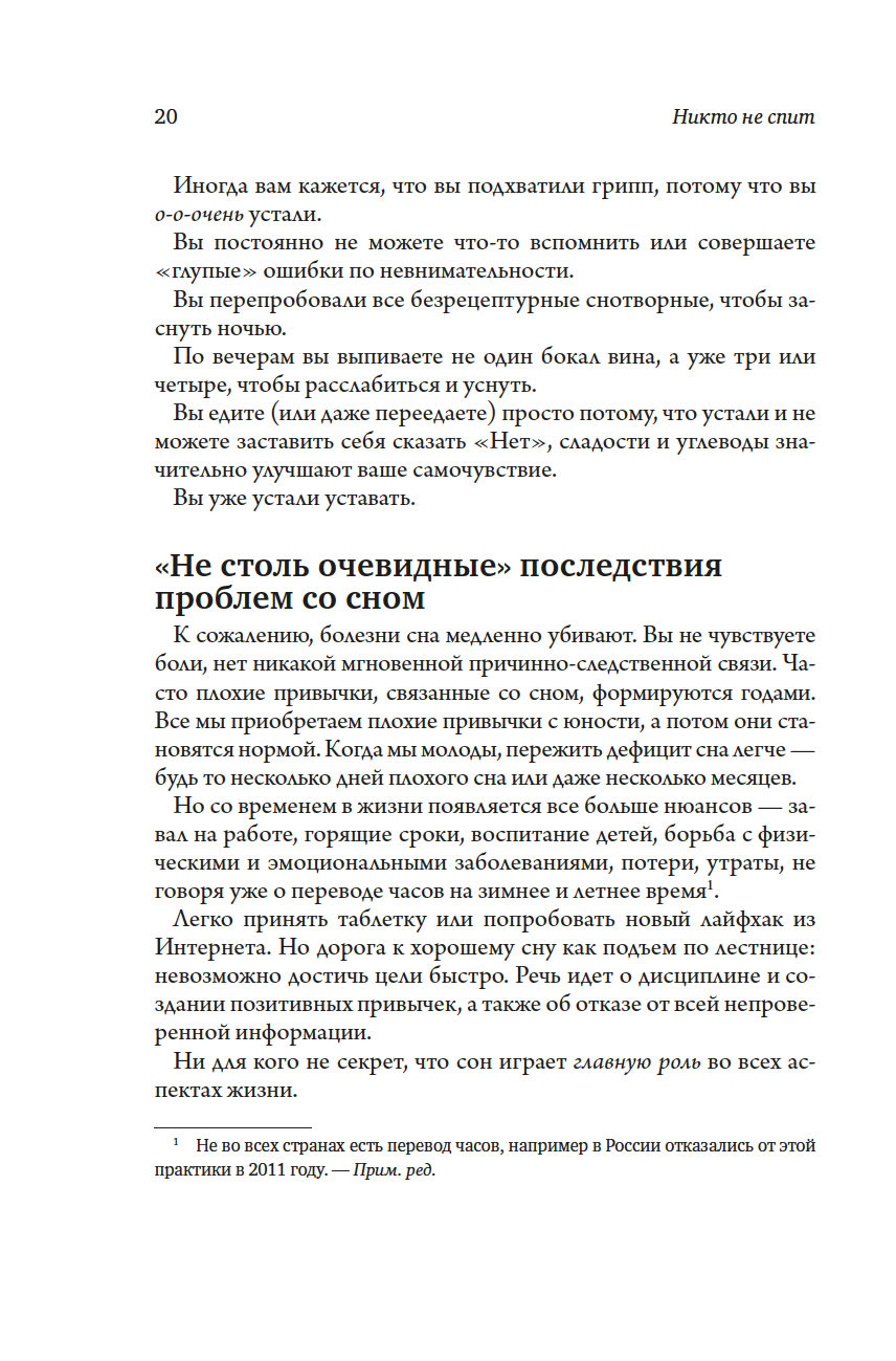Отказываясь от временных решений, предлагаемых снотворными таблетками, доктор Джон отстаивает долгосрочный, целостный подход к преодолению проблем со сном. Он знакомит с опасностями нарушения сна и предлагает проверенные стратегии быстрого засыпания, поддержания глубокого сна и пробуждения с ощущением полного восстановления сил. "Никто не спит" – это надежный помощник в борьбе за качественный и здоровый сон.