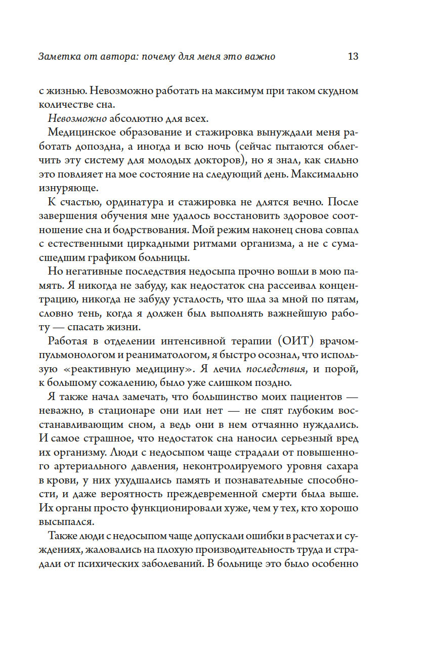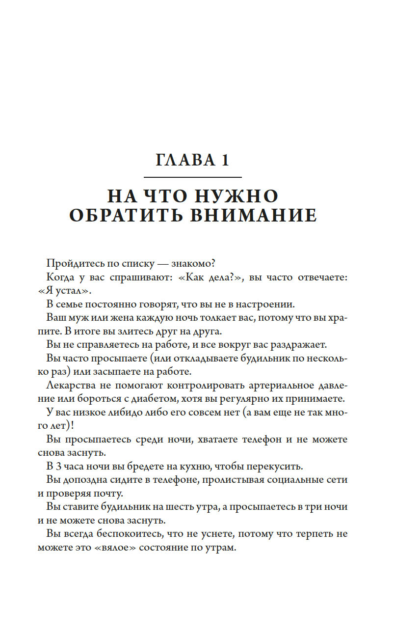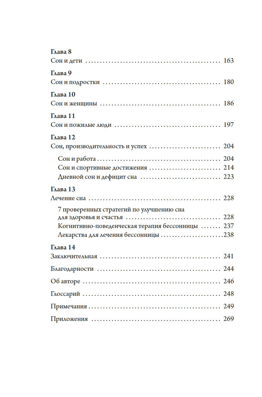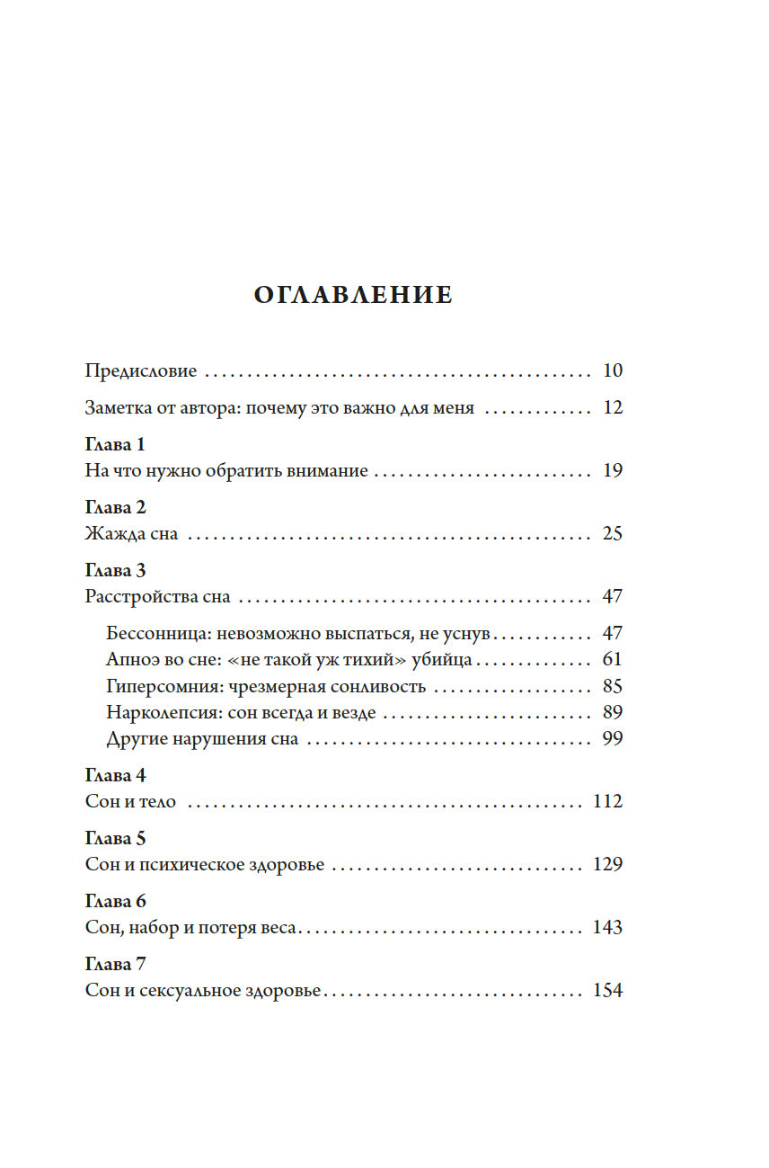 Он подробно рассматривает влияние сна на здоровье и весь организм: гормоны, давление, память, набор веса, либидо и т. д.