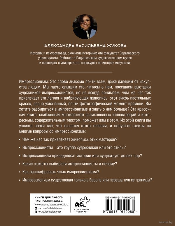 Импрессионизм. Это слово знакомо почти всем, даже далеким от искусства людям. Мы часто слышим его, читаем о нем, посещаем выставки художников-импрессионистов, но не всегда понимаем, чем же нас так привлекает эта легкая и вибрирующая живопись, этот вихрь пастельных красок, верно ухваченный, почти фотографический момент времени. Вы хотите разбираться в импрессионизме и знать о нем больше? Эта красочная книга, снабженная множеством великолепных иллюстраций и интересным, содержательным текстом, поможет вам в этом. Из этой книги вы узнаете почти все, что касается этого течения, и получите ответы на многие вопросы об импрессионизме.