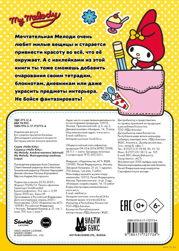 Мечтательная Мелоди очень любит милые вещицы и старается привнести красоту во всё, что её окружает. А с наклейками из этой книги ты тоже сможешь добавить очарования своим тетрадям, блокнотам, дневникам или даже украсить предметы интерьера.