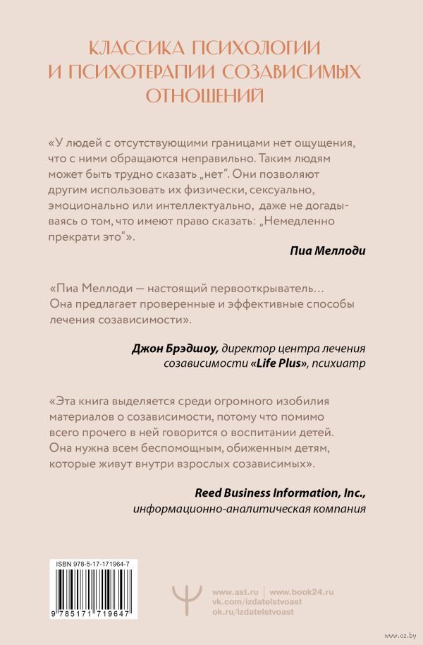 Пиа Меллоди – всемирно известный лектор, автор нескольких бестселлеров и специалист по работе с детскими травмами. Ее книги переведены на многие языки. Более 25 лет Пиа Меллоди работала в одном из лучших реабилитационных центров США – The Meadows Treatment Center.