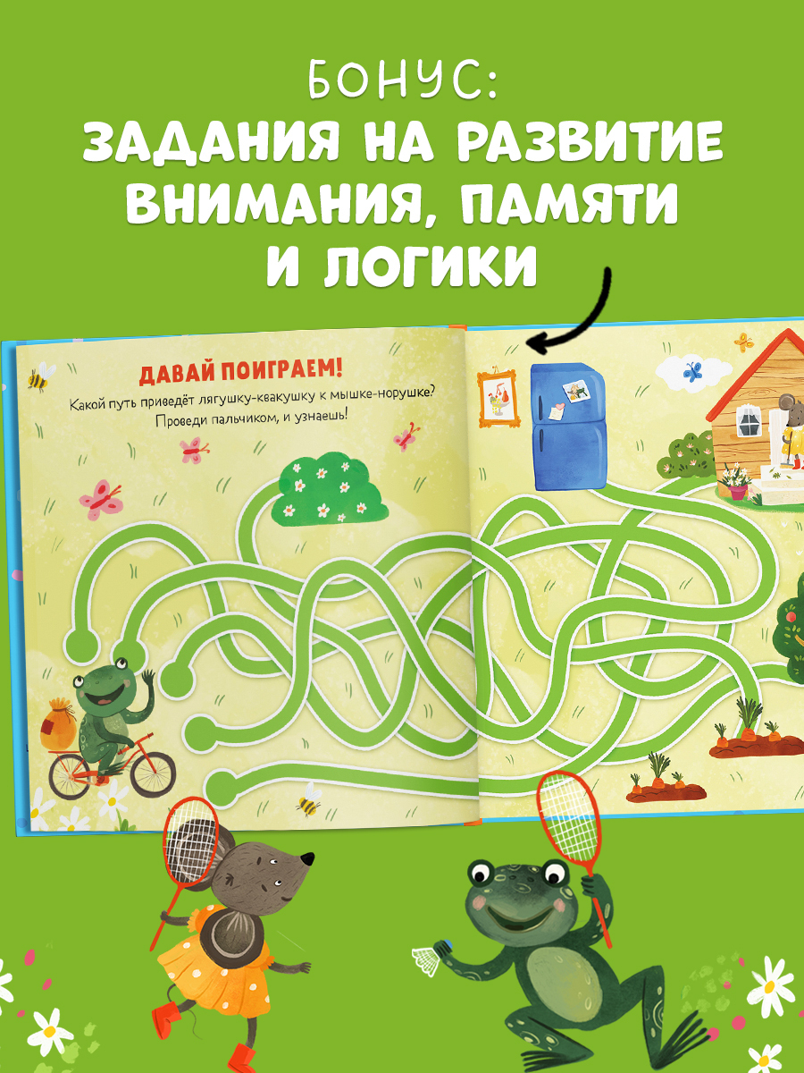 На каждом развороте малыша ждет игра "найди и покажи" – 5 предметов для поиска на большой иллюстрации. А в конце книги – задания (лабиринт и поиск отличий), развивающие логическое мышление, внимание, сообразительность и усидчивость.