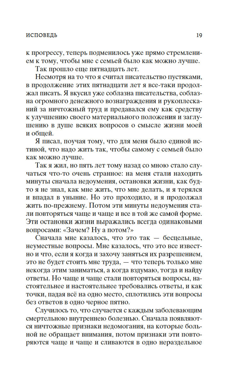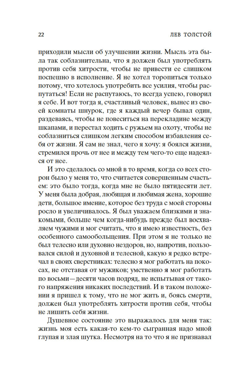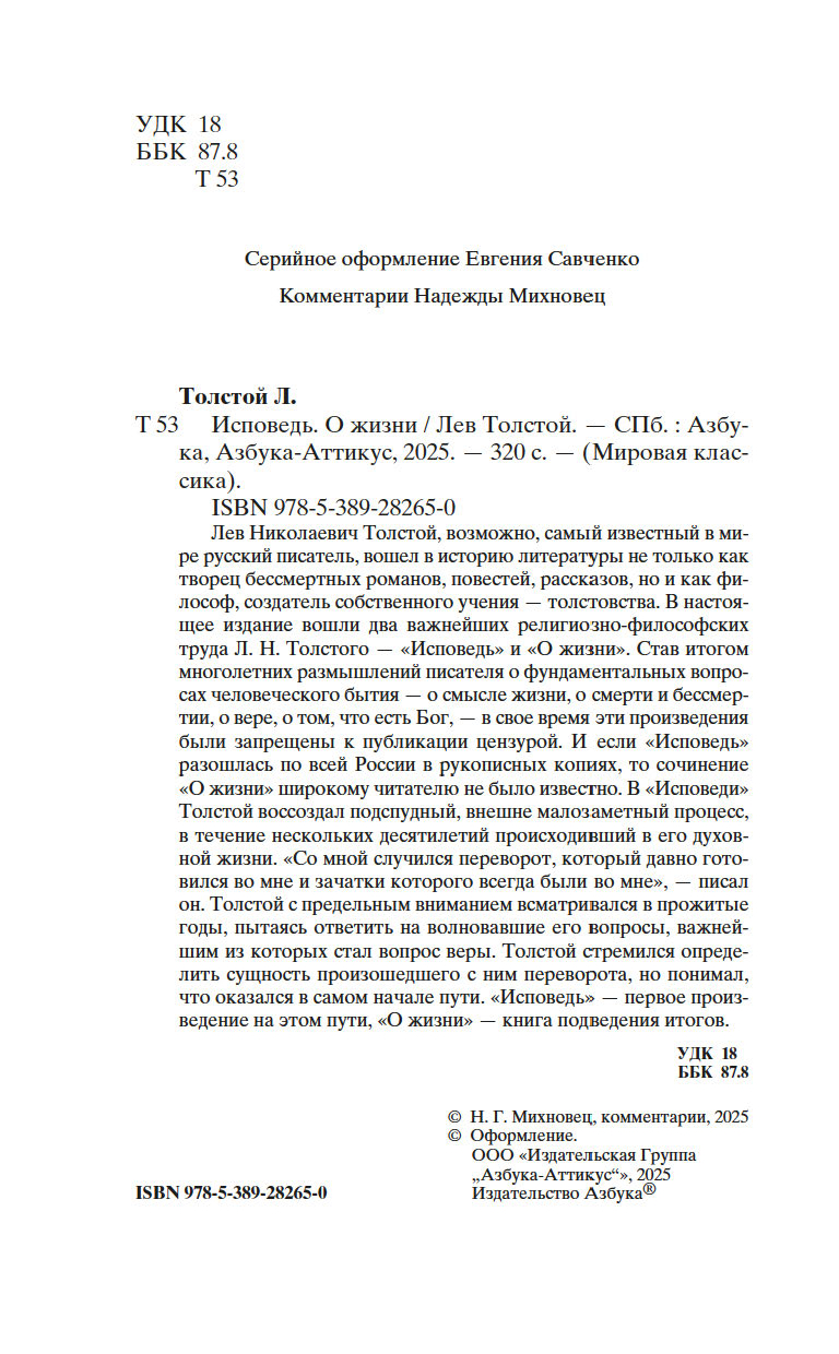 Лев Николаевич Толстой, возможно, самый известный в мире русский писатель, вошел в историю литературы не только как творец бессмертных романов, повестей, рассказов, но и как философ, создатель собственного учения – толстовства. В настоящее издание вошли два важнейших религиозно-философских труда Л. Н. Толстого – "Исповедь" и "О жизни". Став итогом многолетних размышлений писателя о фундаментальных вопросах человеческого бытия – о смысле жизни, о смерти и бессмертии, о вере, о том, что есть Бог, – в свое время эти произведения были запрещены к публикации цензурой. И если "Исповедь" разошлась по всей России в рукописных копиях, то сочинение "О жизни" широкому читателю не было известно.