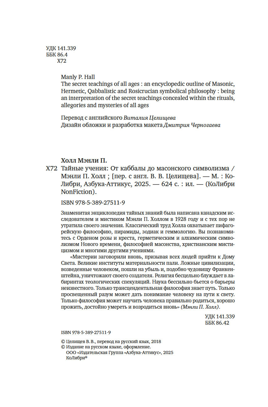 Знаменитая энциклопедия тайных знаний была написана канадским исследователем и мистиком Мэнли П. Холлом в 1928 году и с тех пор не утратила своего значения. Классический труд Холла охватывает пифагорейскую философию, пирамиды, зодиак и геммологию. Вы познакомитесь с Орденом розы и креста, герметическим и алхимическим символизмом Нового времени, философией масонства, христианским мистицизмом и многими другими учениями.