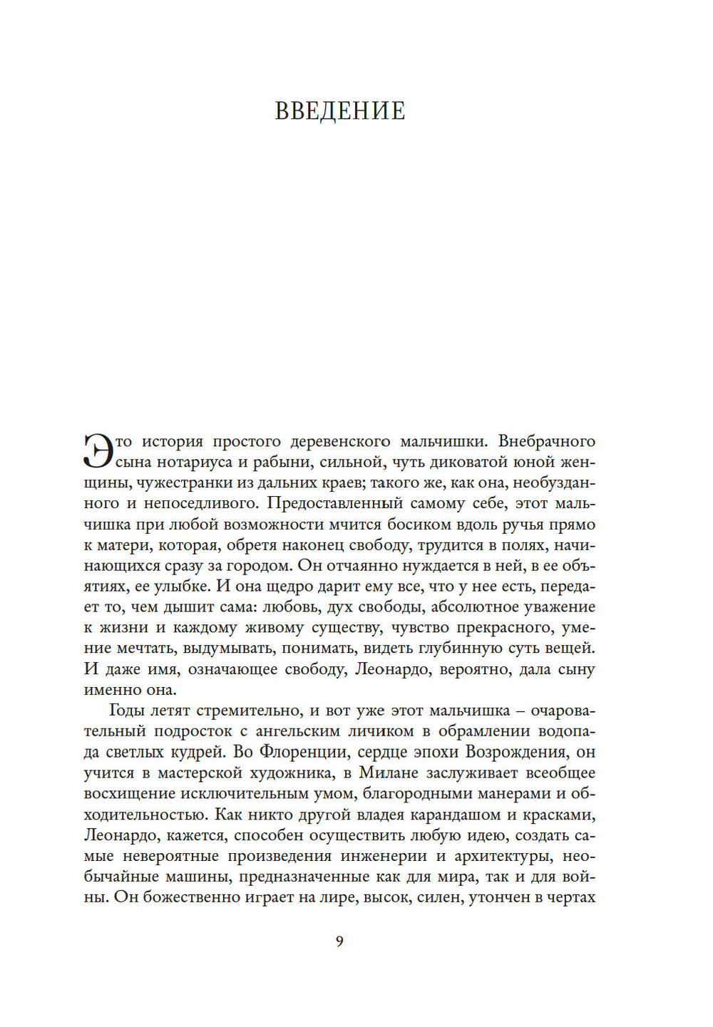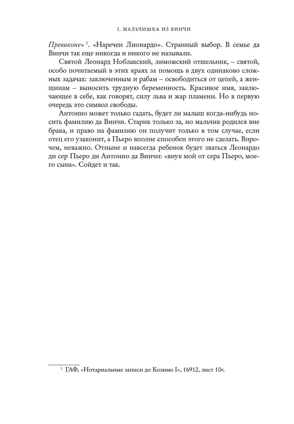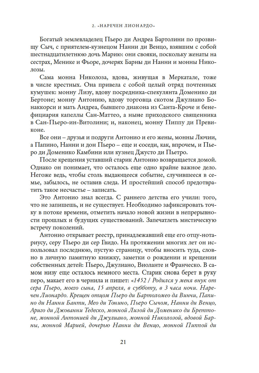 Это история простого деревенского мальчишки. Внебрачного сына нотариуса и рабыни, сильной, юной женщины, чужестранки из дальних краев. Леонардо, имя, означающее свободу, вероятно, дала сыну именно она.