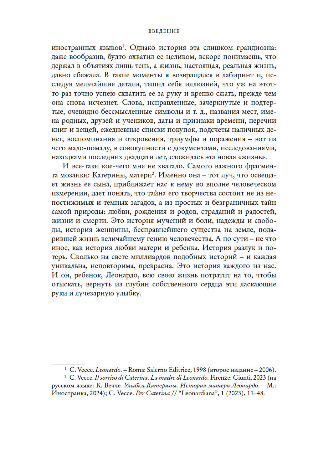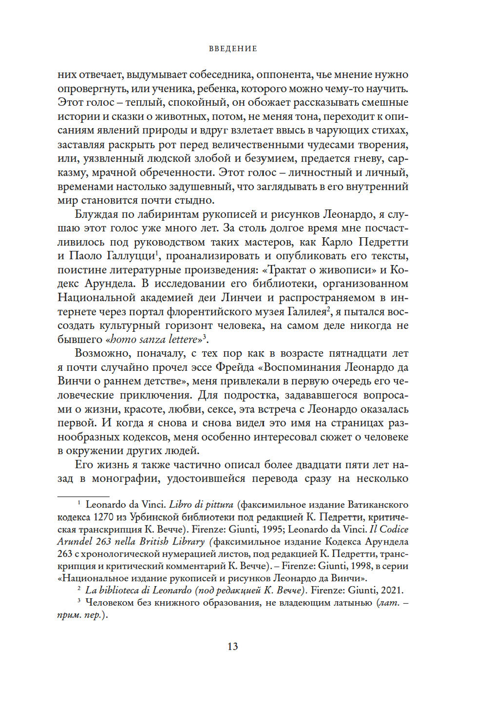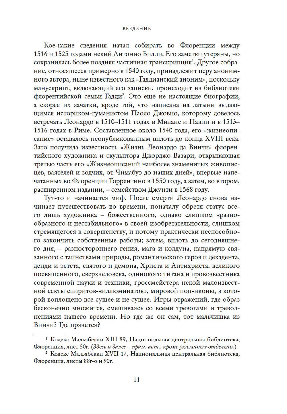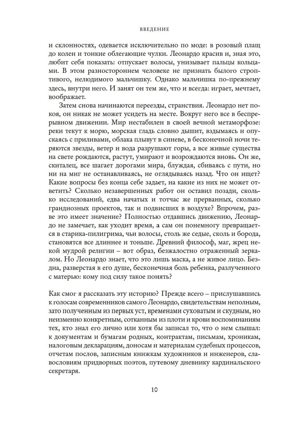 Как смог я рассказать эту историю? Прежде всего – прислушавшись к голосам современников самого Леонардо, свидетельствам неполным, зато полученным из первых уст,.. воспоминаниям тех, кто знал его лично, к документам и бумагам родных, контрактам, письмам, хроникам, налоговым декларациям, доносам и материалам судебных процессов, отчетам послов, записным книжкам художников и инженеров, славословиям придворных поэтов, путевому дневнику кардинальского секретаря.