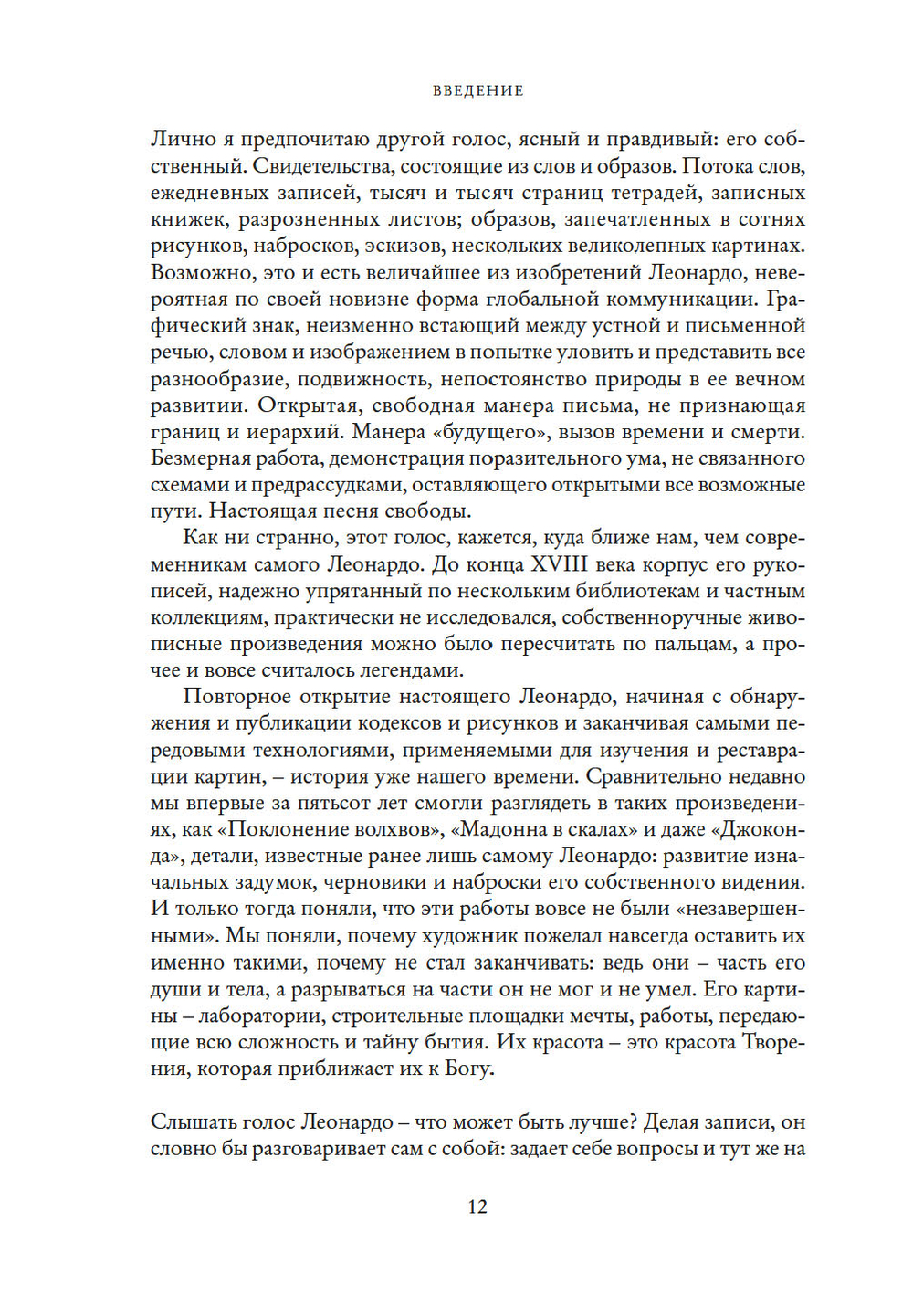 Лично я предпочитаю другой голос, ясный и правдивый: его собственный. Свидетельства, состоящие из слов и образов. Потока слов, ежедневных записей, тысяч и тысяч страниц тетрадей, записных книжек, разрозненных листов; образов, запечатленных в сотнях рисунков, набросков, эскизов, нескольких великолепных картинах. Возможно, это и есть величайшее из изобретений Леонардо, невероятная по своей новизне форма глобальной коммуникации. Открытая, свободная манера письма, не признающая границ и иерархий. Манера "будущего", вызов времени и смерти. Безмерная работа, демонстрация поразительного ума, не связанного схемами и предрассудками, оставляющего открытыми все возможные пути. Настоящая песня свободы.