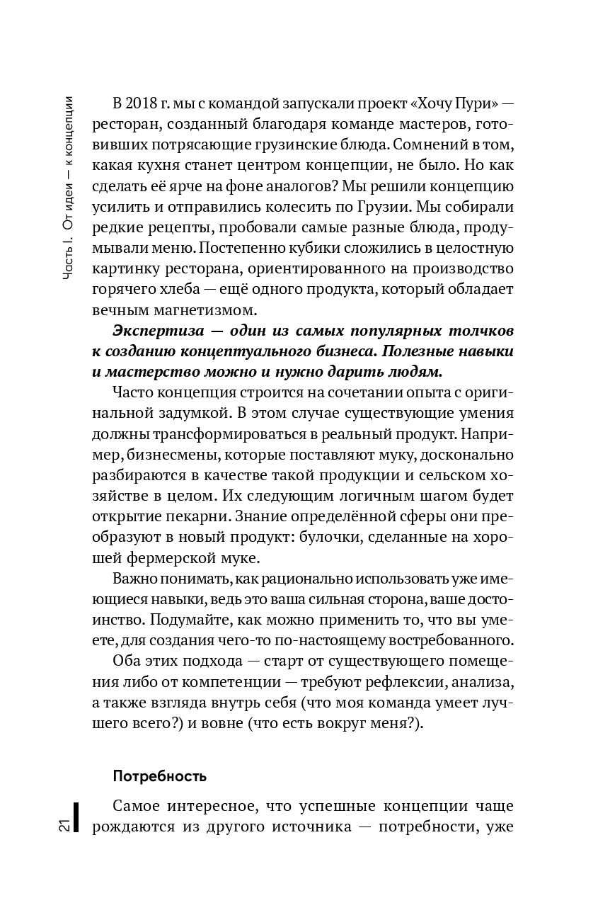 Главная цель Ирины Измайловой – научить читателей мыслить концептуально и создавать проекты, которые будут выделяться на рынке и привлекать клиентов. Независимо от того, планируете ли вы открыть ресторан, салон красоты или любой другой бизнес, принципы, изложенные в книге, помогут создать прочный фундамент для реализации идей.