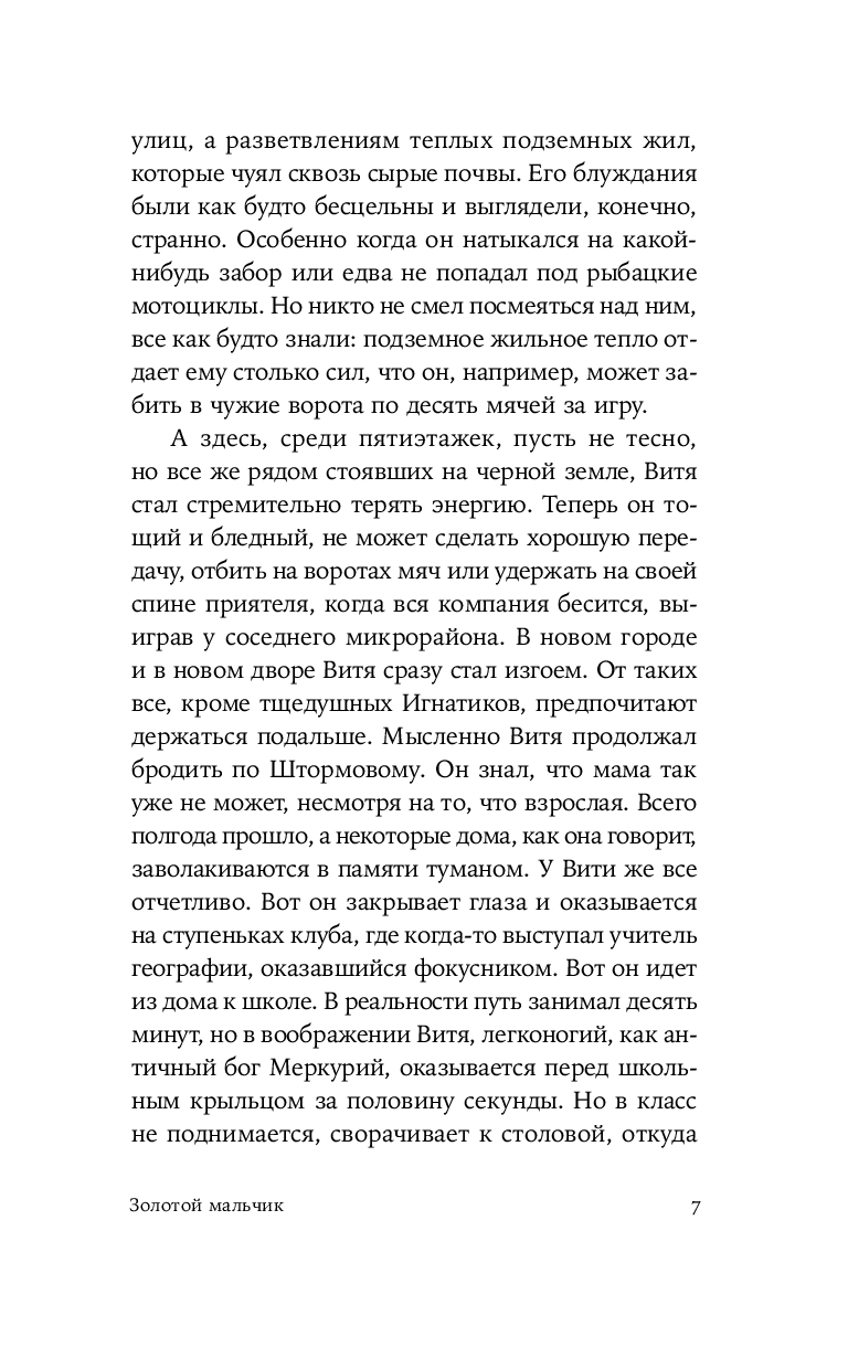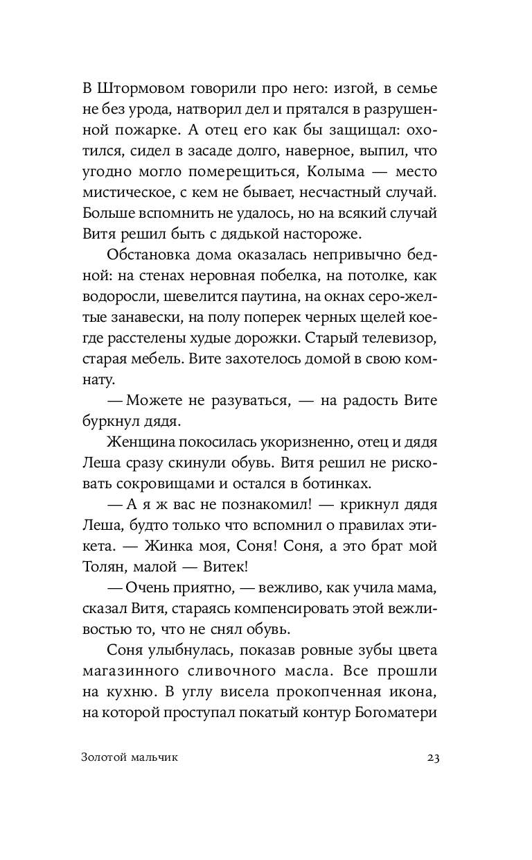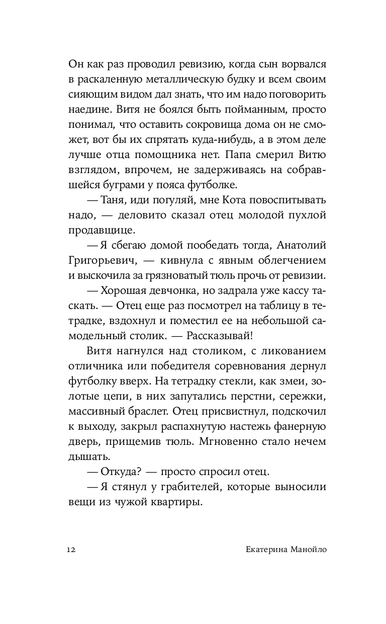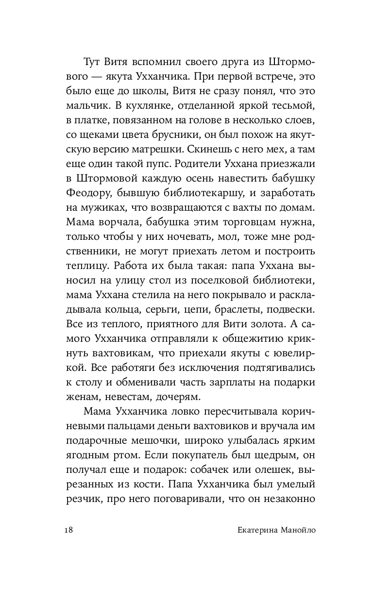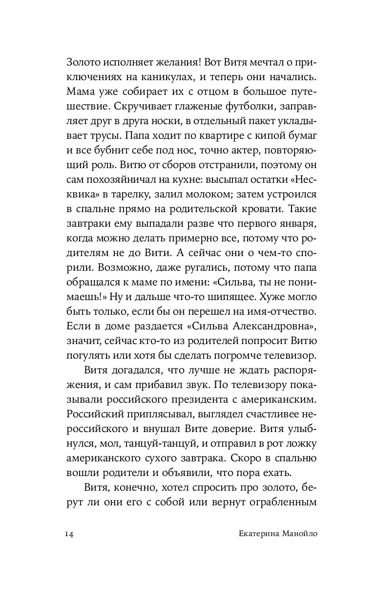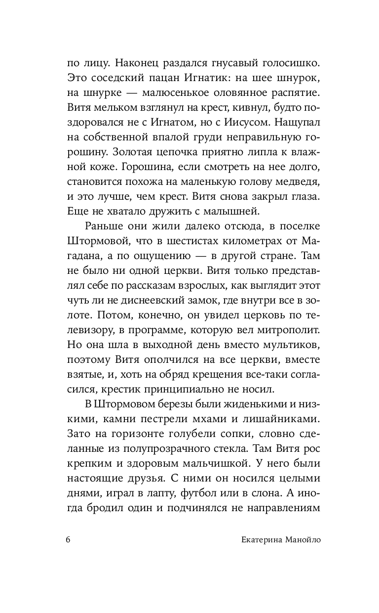 Герой нового романа Екатерины Манойло – мальчик Витя, обладающий необычным даром: он способен чувствовать золото под землей и в воде, отзываясь на его тепло трепетным эхом. Витя родился в посёлке Штормовом под Магаданом, среди золотоносных жил, где местные зарабатывают контрабандой драгоценного металла. Уникальное умение мальчика не может остаться в секрете – им начинают интересоваться злые люди, демоны этих мест. Чтобы спасти ребёнка, его родители решаются на опасное путешествие в поисках другой судьбы. Теперь, за многие тысячи километров от прииска, золото, бывшее в прошлой жизни постоянным спутником и источником силы Вити, становится магическим проводником в необъятном и чуждом мире.