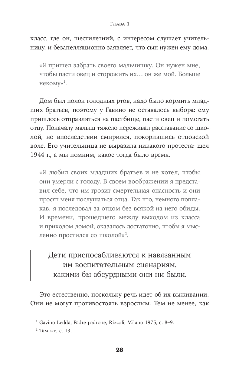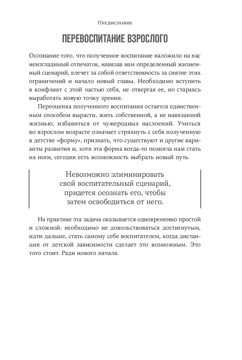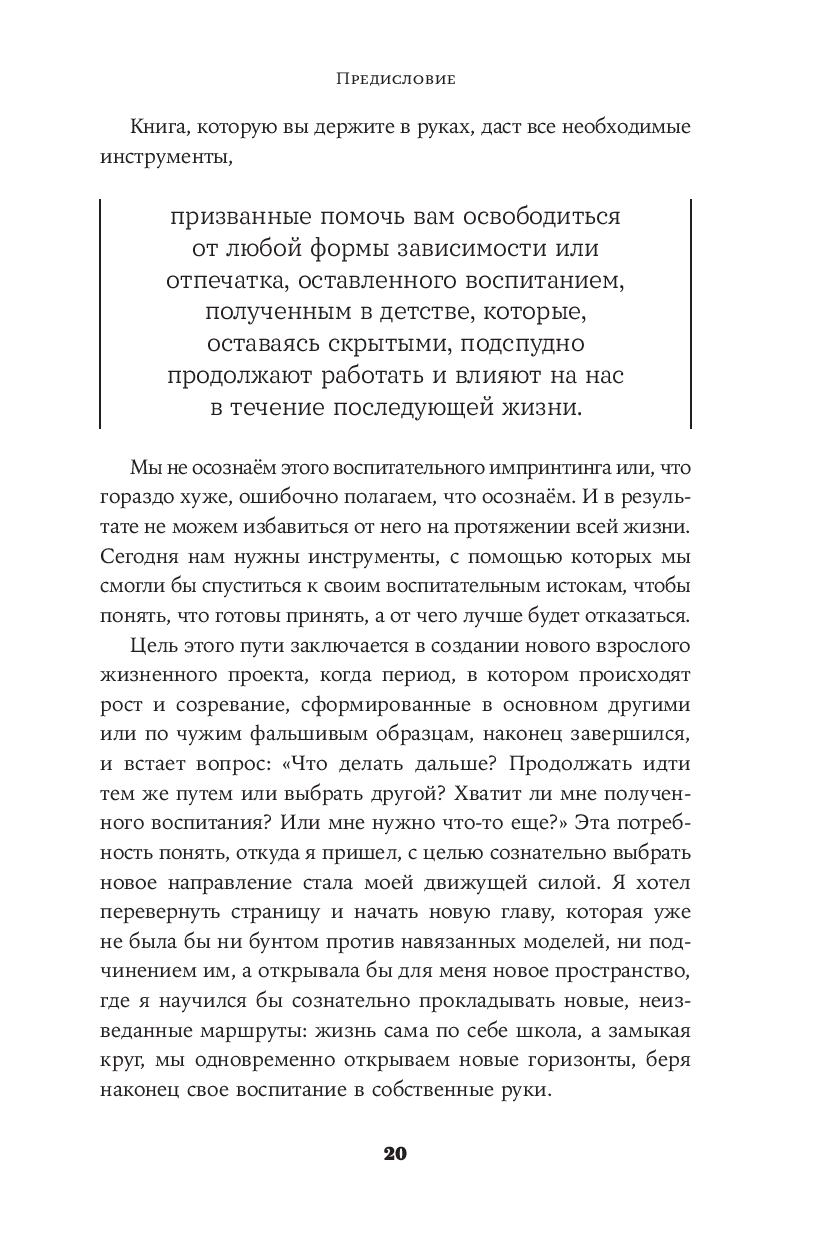 Даниэле Новара исследует феномен бессознательного копирования родительских моделей поведения и предлагает практические инструменты для осознанного выбора собственного пути. Он анализирует различные типы семейных сценариев: от гиперопеки до эмоциональной недоступности, от авторитарного воспитания до попустительства. Автор объясняет, как эти сценарии влияют на формирование личности, самооценку и межличностные отношения.
