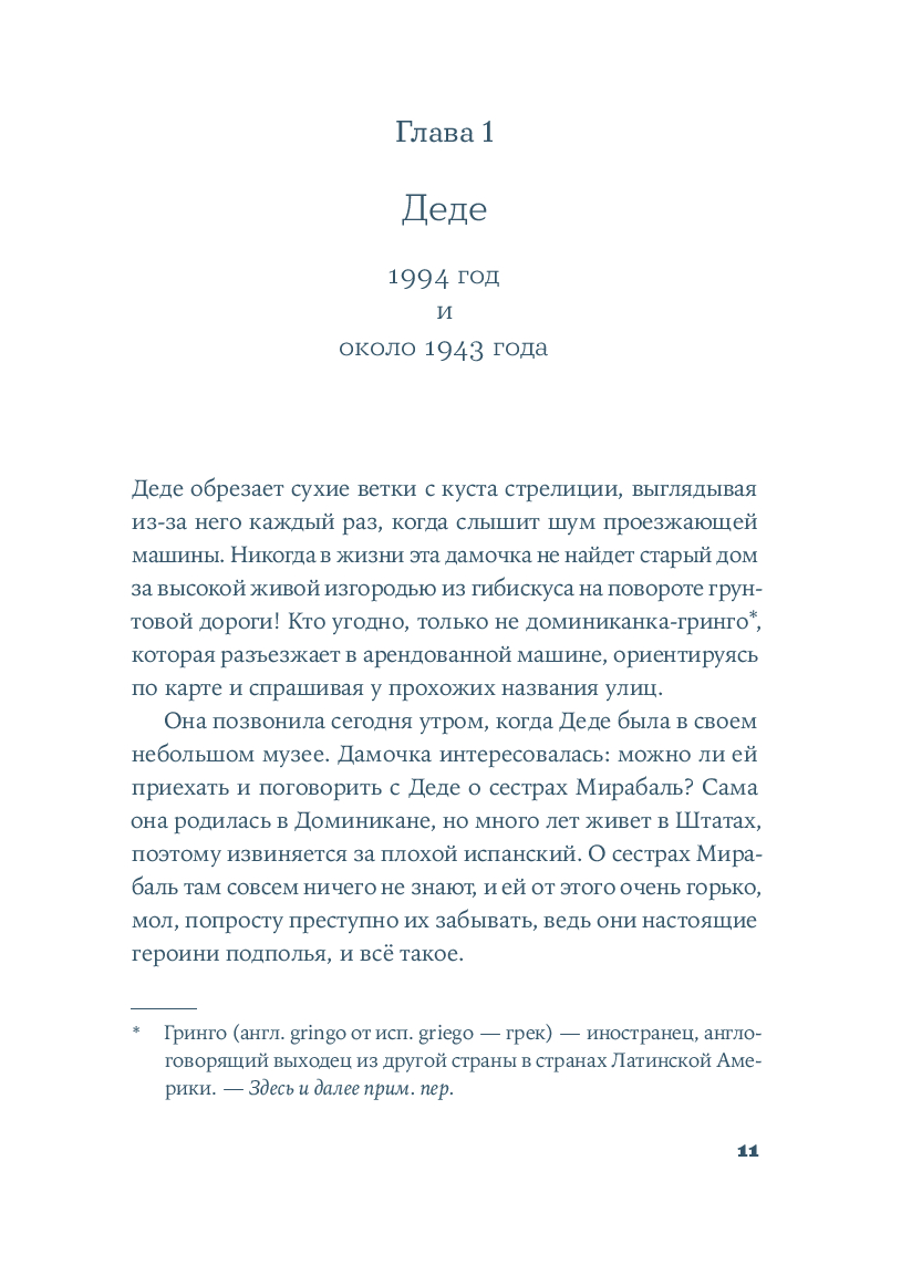 Каждая экскурсия по дому с портретами на стенах напоминает Деде о прошлом. Только "сестра, которая выжила" знает, какими искренними и смелыми были Las Mariposas – "Бабочки", героини Доминиканской Республики. Религиозная Патрия, амбициозная Минерва и беззаботная Мате взрослели, влюблялись и мечтали о будущем. Но режим Рафаэля Трухильо отравлял жизнь людей, превращая их родину в клетку размером со всю страну.