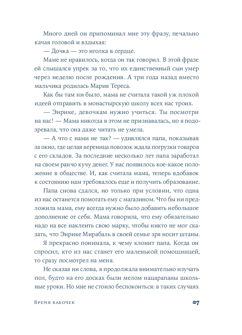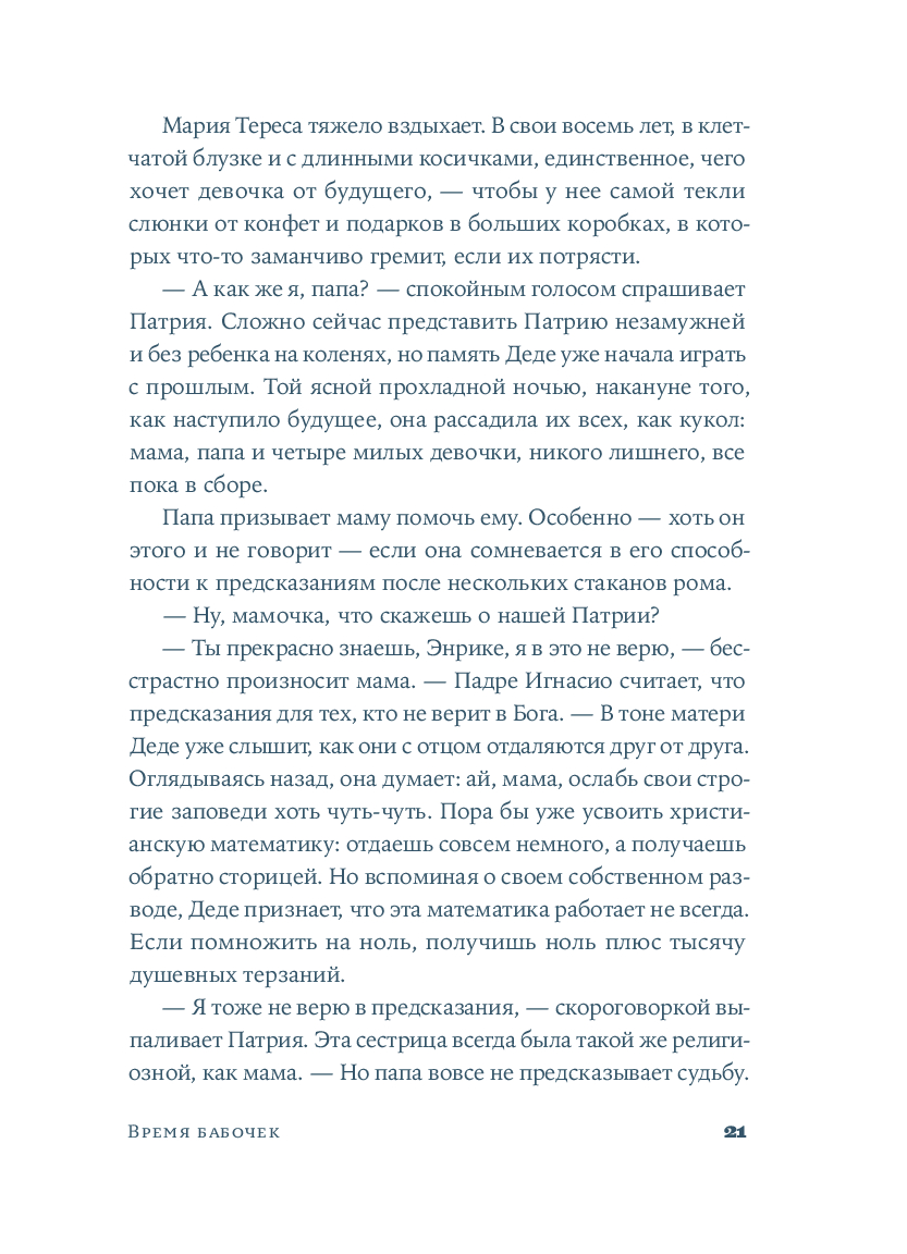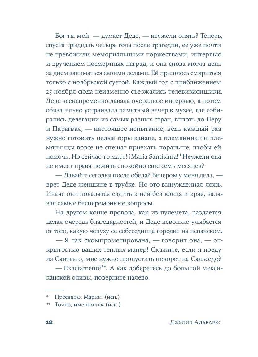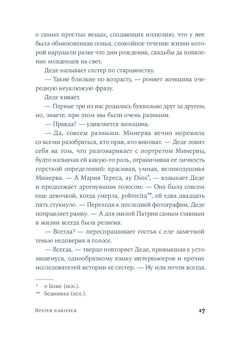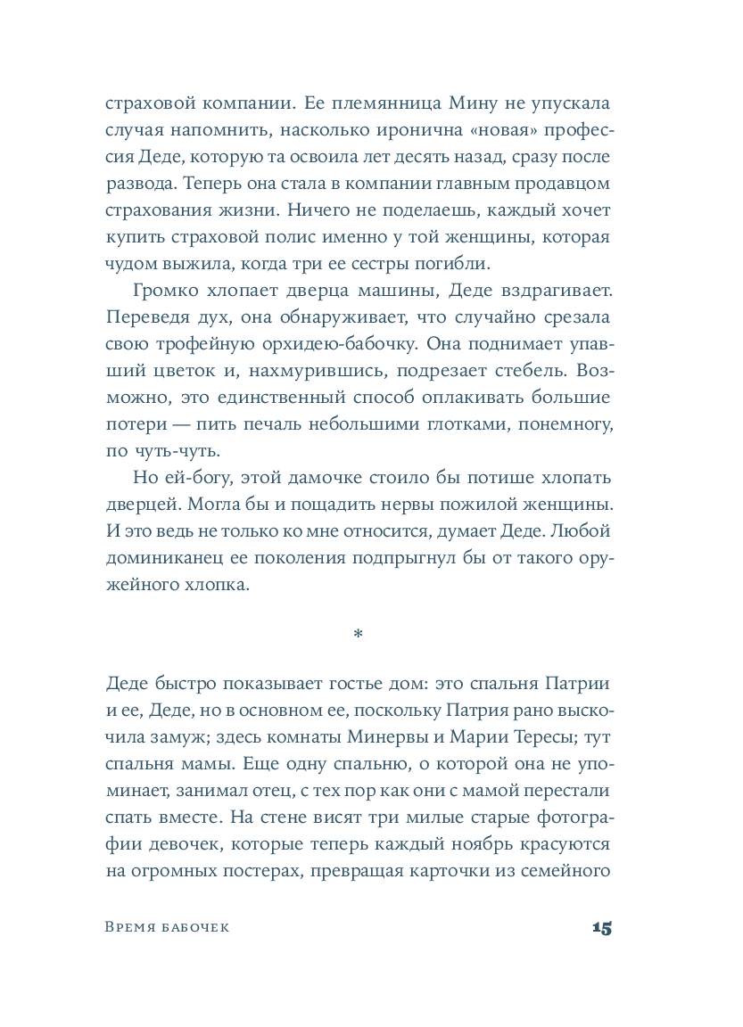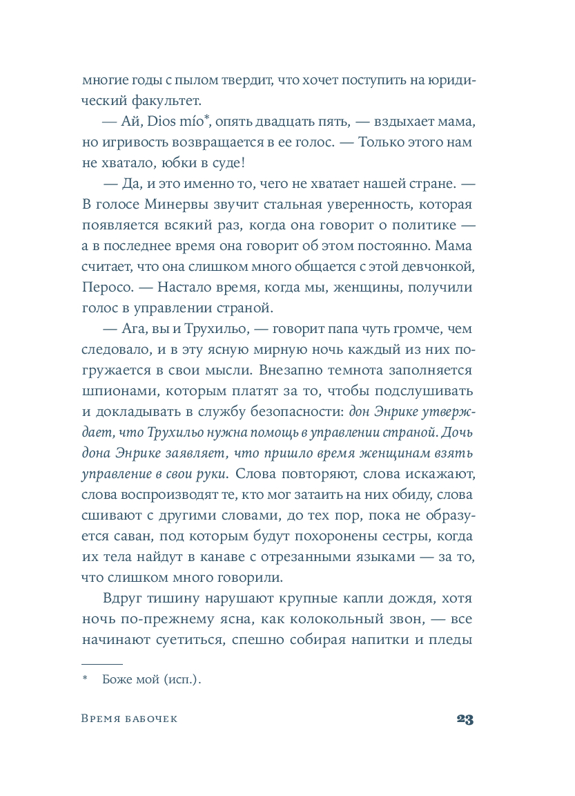 Для Джулии Альварес, семья которой едва успела спастись от расправы диктатора, история сестер Мирабаль глубоко личная. Писательница дала слово каждой из "Бабочек". Она возвратила женщинам, боровшимся с тираном и превратившимся в национальный миф, право сомневаться, злиться, трусить, презирать – быть собой. Подлинные судьбы и поэтичный язык автора сделали этот пронзительный роман национальной классикой и мировым бестселлером.