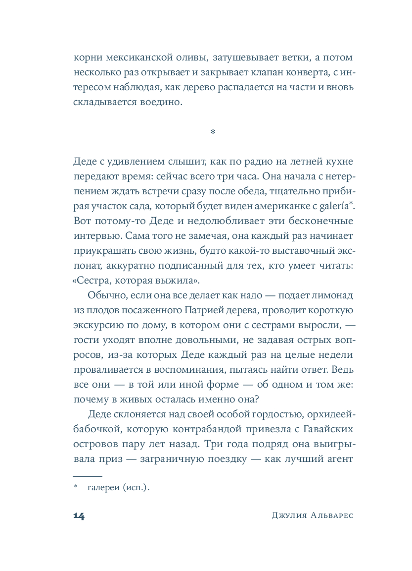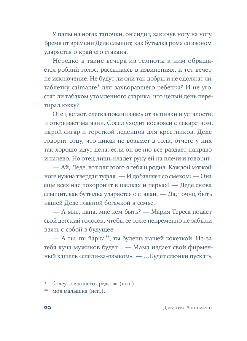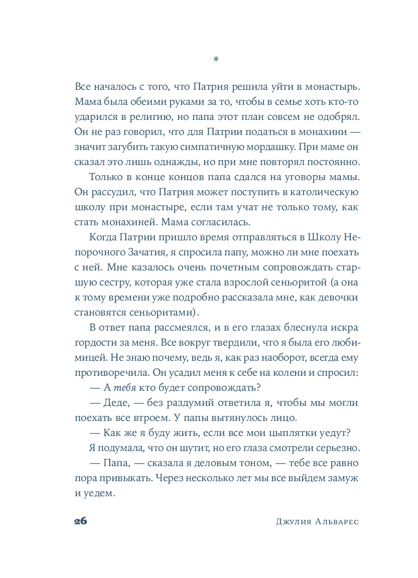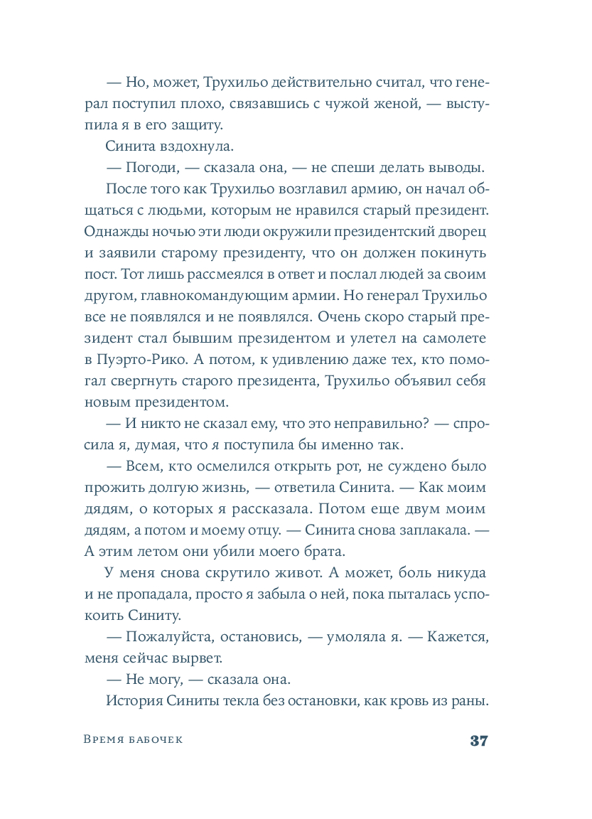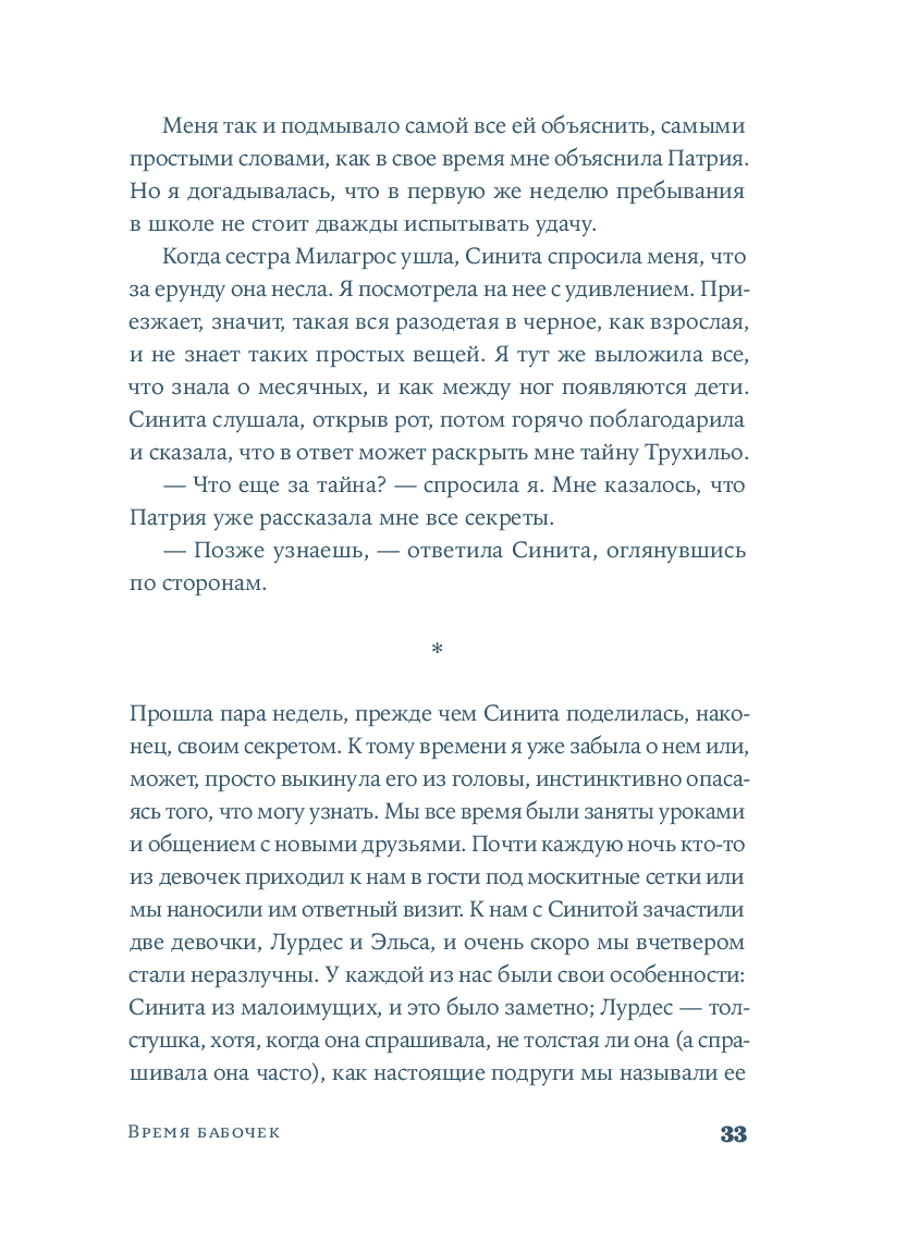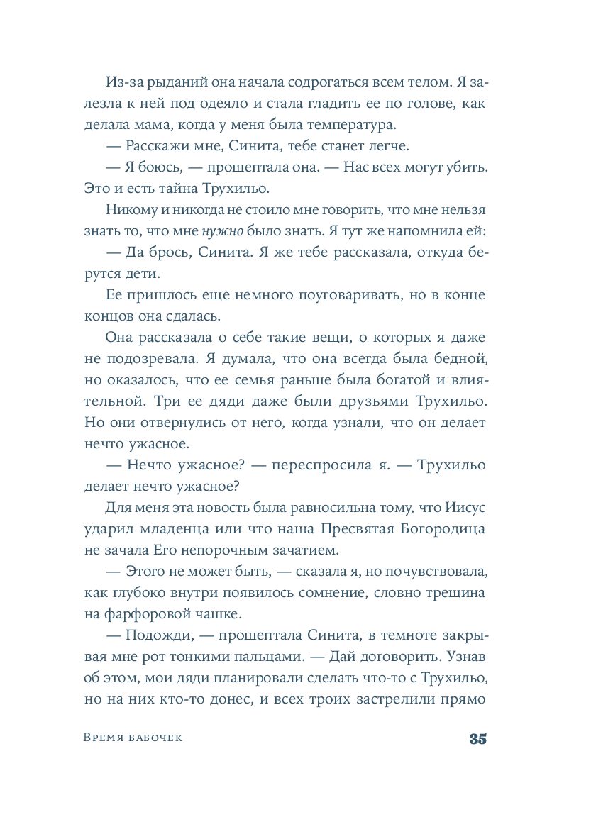 Для Джулии Альварес, семья которой едва успела спастись от расправы диктатора, история сестер Мирабаль глубоко личная. Писательница дала слово каждой из "Бабочек". Она возвратила женщинам, боровшимся с тираном и превратившимся в национальный миф, право сомневаться, злиться, трусить, презирать – быть собой. Подлинные судьбы и поэтичный язык автора сделали этот пронзительный роман национальной классикой и мировым бестселлером.