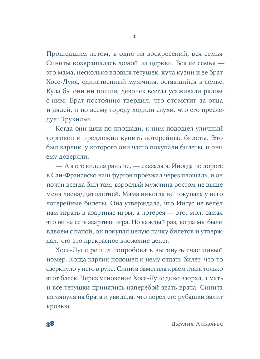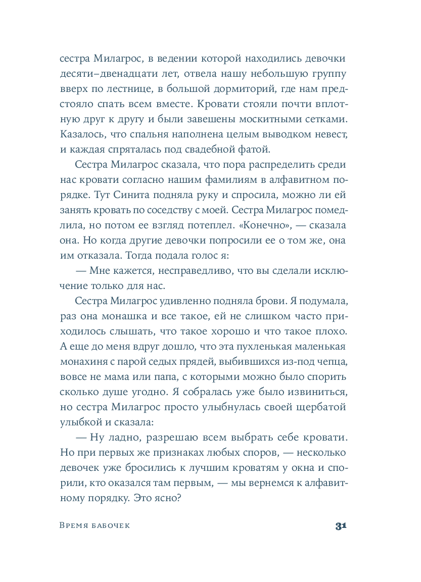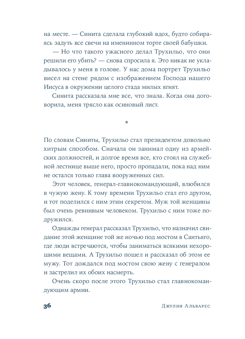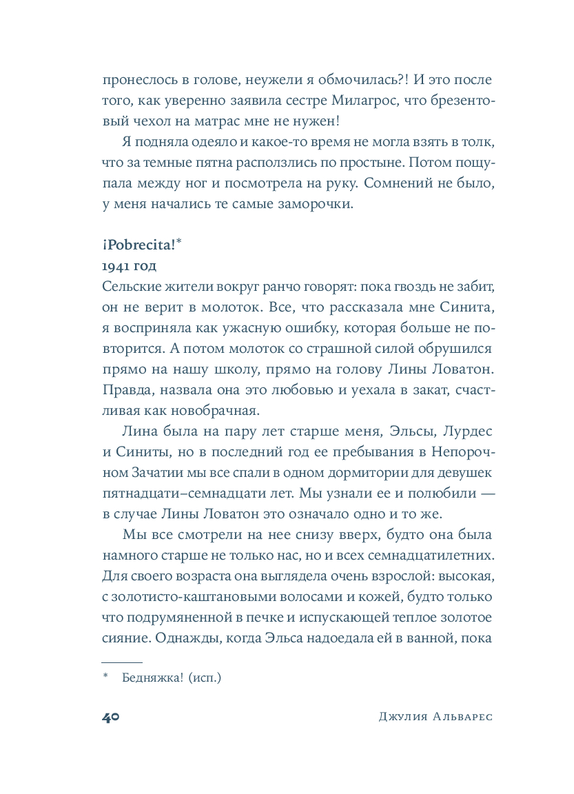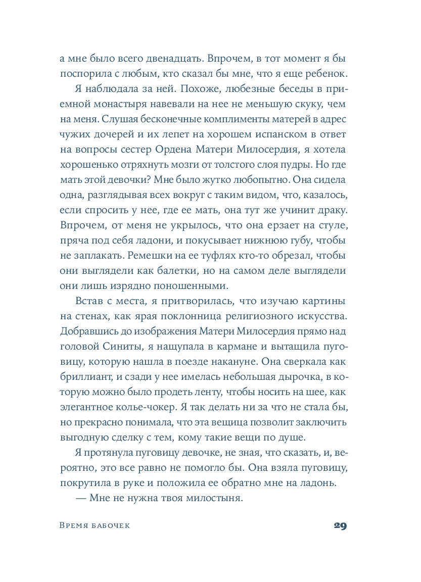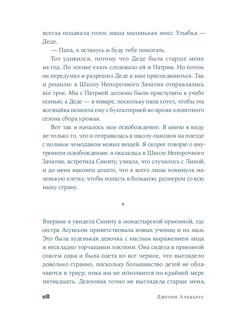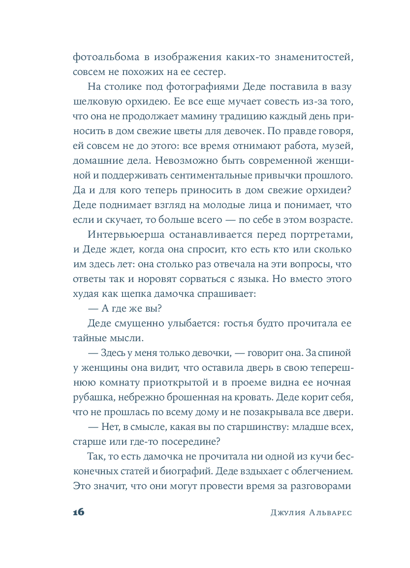 Для Джулии Альварес, семья которой едва успела спастись от расправы диктатора, история сестер Мирабаль глубоко личная. Писательница дала слово каждой из "Бабочек". Она возвратила женщинам, боровшимся с тираном и превратившимся в национальный миф, право сомневаться, злиться, трусить, презирать – быть собой. Подлинные судьбы и поэтичный язык автора сделали этот пронзительный роман национальной классикой и мировым бестселлером.