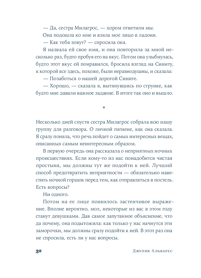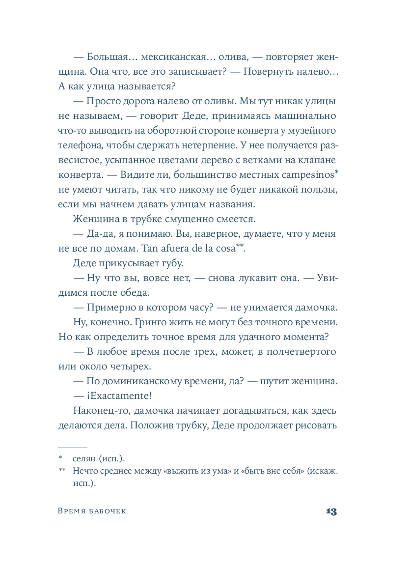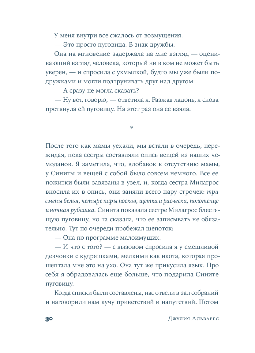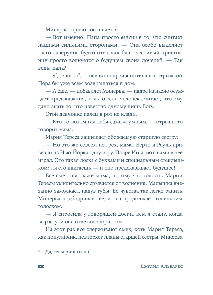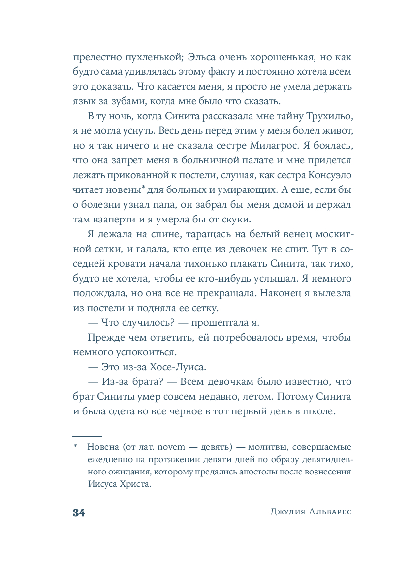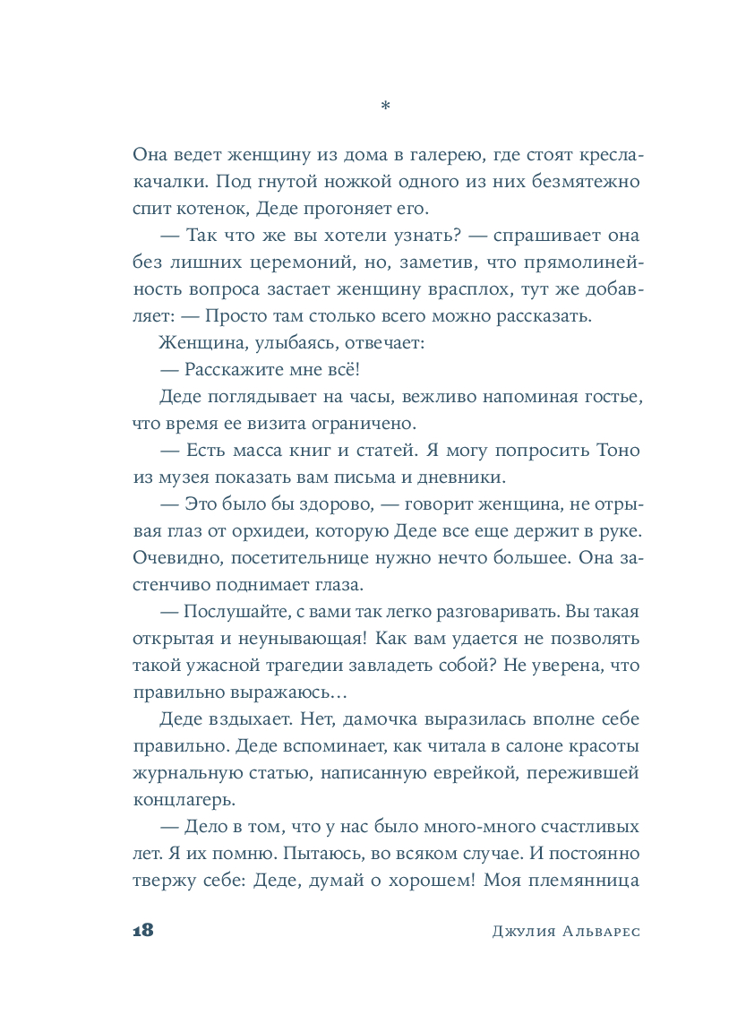 Для Джулии Альварес, семья которой едва успела спастись от расправы диктатора, история сестер Мирабаль глубоко личная. Писательница дала слово каждой из "Бабочек". Она возвратила женщинам, боровшимся с тираном и превратившимся в национальный миф, право сомневаться, злиться, трусить, презирать – быть собой. Подлинные судьбы и поэтичный язык автора сделали этот пронзительный роман национальной классикой и мировым бестселлером.