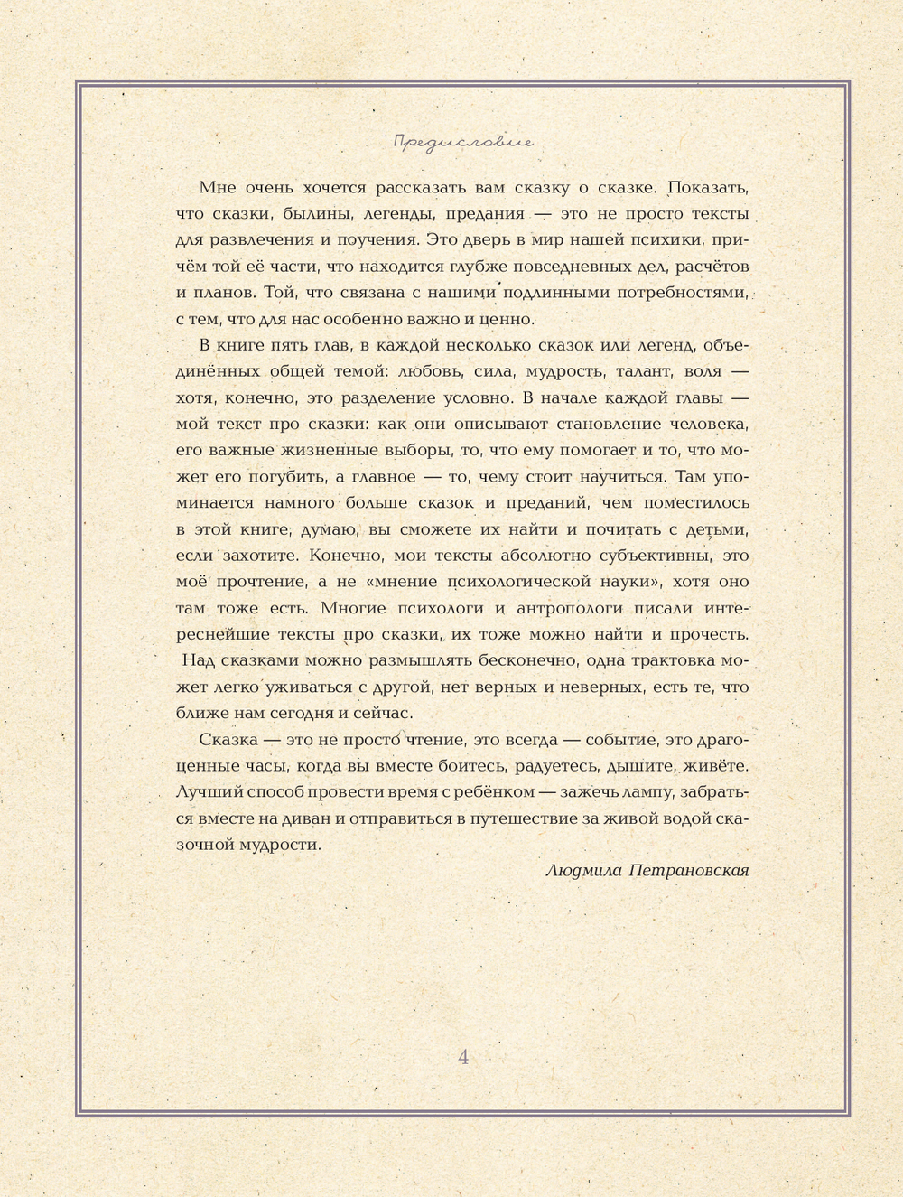 Книга состоит из пяти частей – эссе Людмилы о том, как именно влияют знакомые всем нам с детства сказки на процесс формирования базовых жизненных понятий: силы, таланта, любви, воли и мудрости. После каждого эссе вы найдете сказки, подобранные к теме эссе.