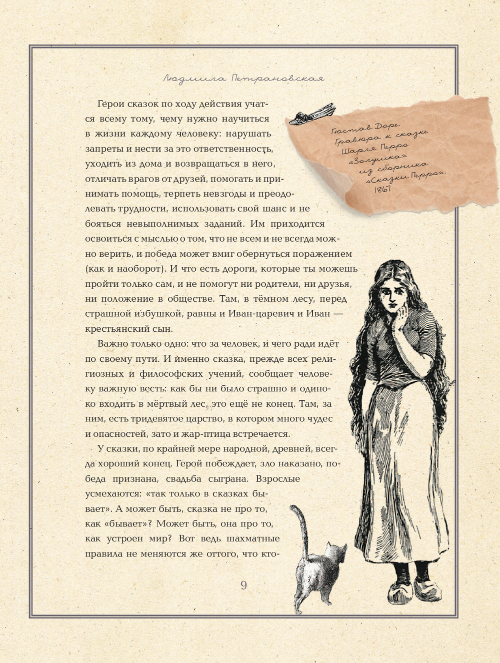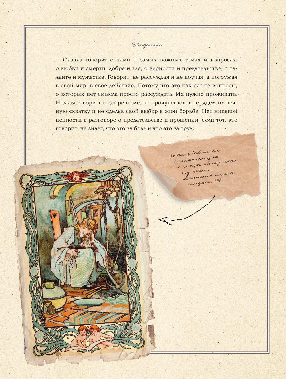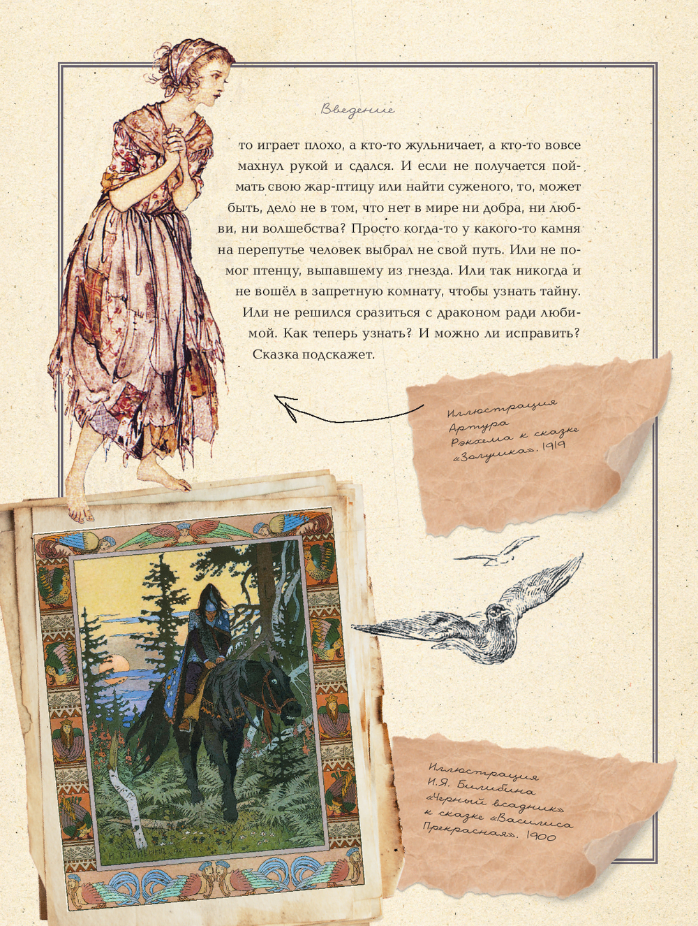 Страница за страницей вы будете заново знакомиться со сказочными героями и их приключениями, открывая для себя неожиданные богатства, спрятанные в "Сказке об Иване-царевиче, Жар-птице и Сером Волке" с иллюстрациями И. Билибина, в сказке Шарля Перро "Кот в сапогах" с иллюстрациями Г. Доре, в средневековом сказании "Тристан и Изольда" с графикой У. Крейна, в сказке братьев Гримм "Замарашка" с иллюстрациями А. Рэкхема и ещё 11 зачитанных до дыр любимых сказках.
