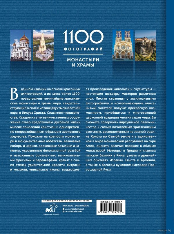 Эта книга расскажет о монастырях и храмах – церковных сооружениях, ставших средоточием духовной жизни человека и его устремлений к высшим сферам бытия, к вере в Бога и бессмертие души. В издании на основе около 1100 зрелищных иллюстраций представлены наиболее крупные и известные христианские обители, соборы и церкви мира. Каждый храм Божий и каждый монастырь, как самый древний, так и совсем новый, вне зависимости от времени основания и принадлежности к конфессии представляет собой не только святилище духа и хранилище священных реликвий, но и подлинный шедевр церковного зодчества. Эти величественные сооружения, созданные талантливыми мастерами разных эпох, украшены роскошной лепниной и белокаменной резьбой, искусными барельефами и скульптурами, уникальными фресками и иконами, яркими мозаиками и витражами, которые, сами по себе являясь святынями, стали гордостью и национальным достоянием тех или иных стран.