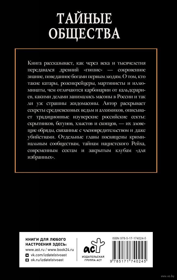 Автор раскрывает секреты средневековых ведьм и алхимиков, описывает традиционные изуверские российские секты: скрытников, бегунов, хлыстов и скопцов; их зловещие обряды, связанные с членовредительством и даже убийствами. Отдельные главы посвящены криминальным сообществам, тайнам нацистского Рейха, современным сектам и закрытым клубам "для избранных".
