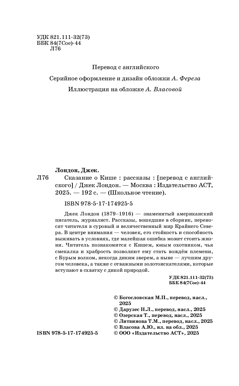 Джек Лондон (1879-1916) – знаменитый американский писатель, журналист. Рассказы, вошедшие в сборник, переносят читателя в суровый и величественный мир Крайнего Севера. В центре внимания – человек, его стойкость и способность выживать в условиях, где малейшая ошибка может стоить жизни. Читатель познакомится с Кишем, юным охотником, чья смекалка и храбрость позволяют ему стать вождём племени, с Бурым волком, некогда диким зверем, а ныне – лучшим другом человека, а также с отважными золотоискателями, которые вступают в схватку с дикой природой.