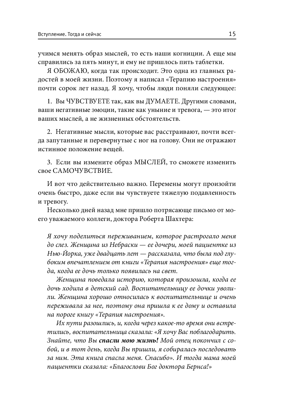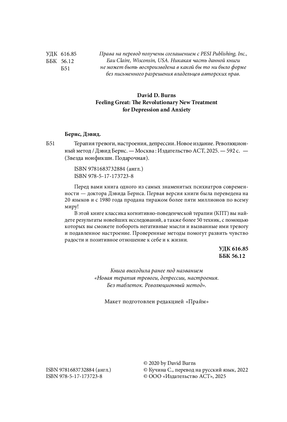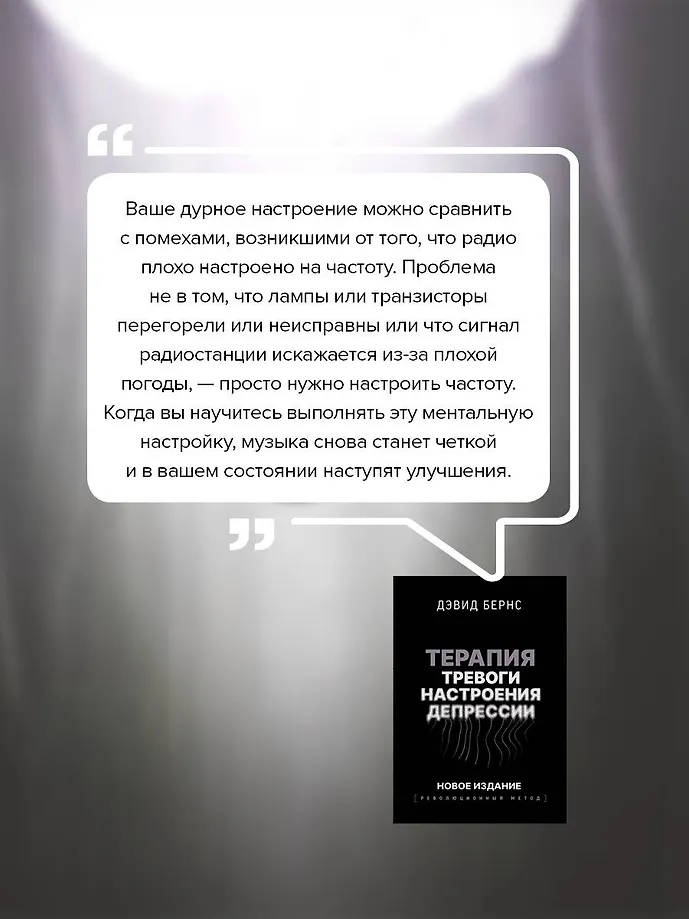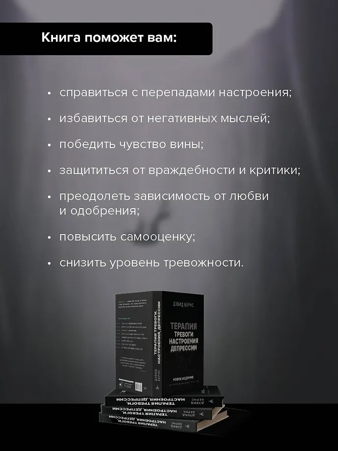 Перед вами самое последнее, дополненное издание классической работы Дэвида Бернса, основанное на новейших исследованиях в области психологии. В книге более 50 техник, с помощью которых вы сможете побороть негативные мысли и вызванные ими тревогу и подавленное настроение. Новые методы помогут развить чувство радости и позитивное отношение к себе и к жизни.