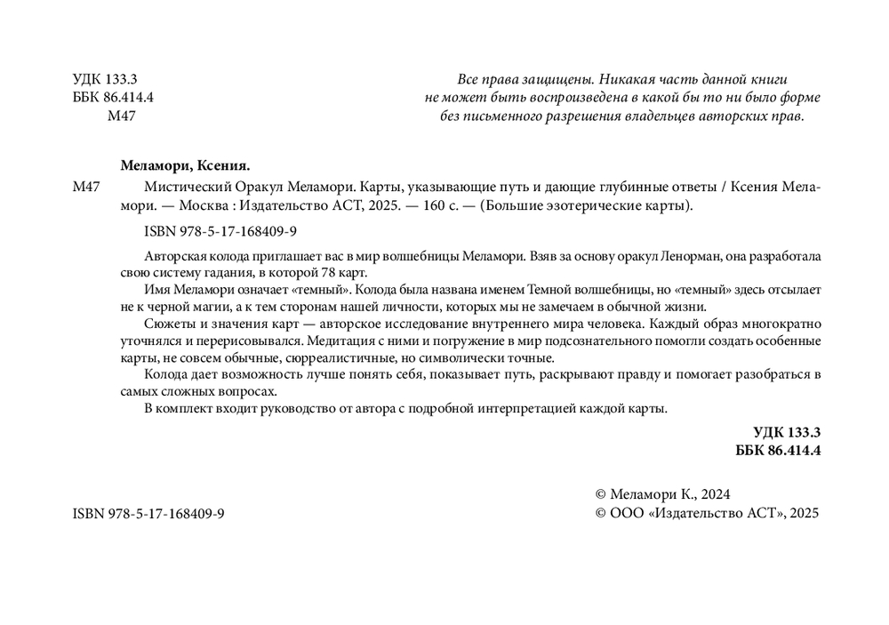 Авторская колода, приглашает нас в мир волшебницы Меламори. Взяв за основу оракул Ленорман, она разработала свою систему гадания, в которой 78 карт.
