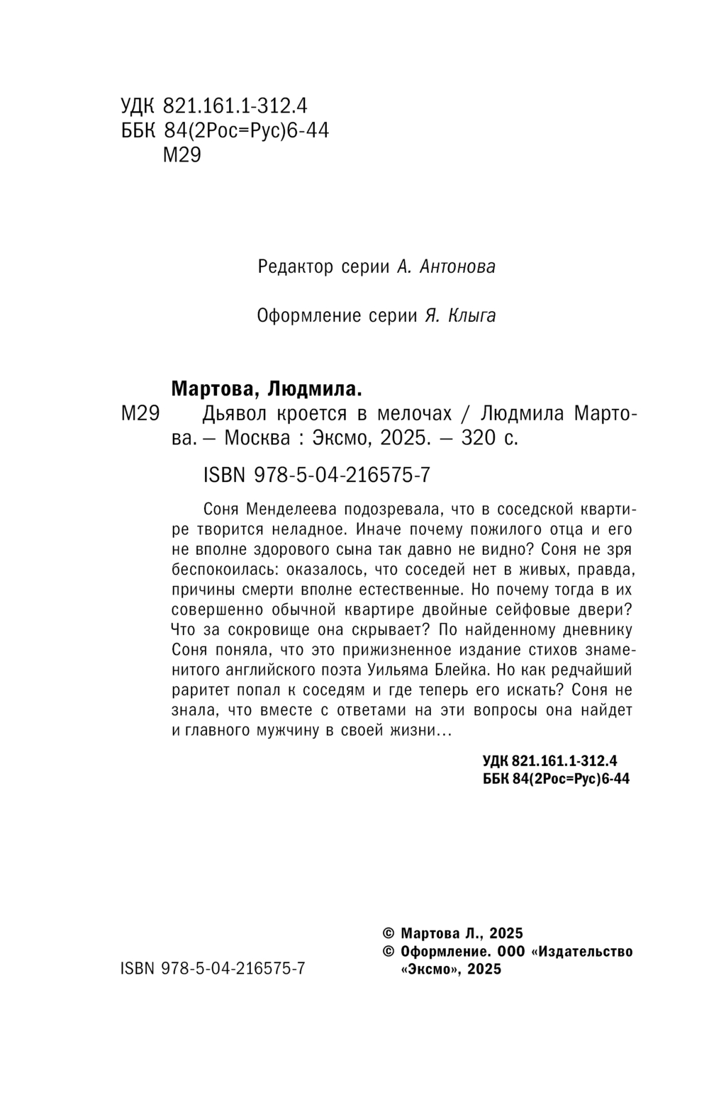 Соня Менделеева подозревала, что в соседской квартире творится неладное. Иначе почему пожилого отца и его не вполне здорового сына так давно не видно? Соня не зря беспокоилась: оказалось, что соседей нет в живых, правда, причины смерти вполне естественные. Но почему тогда в их совершенно обычной квартире двойные сейфовые двери? Что за сокровище она скрывает? По найденному дневнику Соня поняла, что это прижизненное издание стихов знаменитого английского поэта Уильяма Блейка. Но как редчайший раритет попал к соседям и где теперь его искать? Соня не знала, что вместе с ответами на эти вопросы она найдет и главного мужчину в своей жизни…