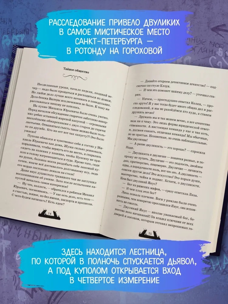 Запутанное расследование привело Двуликих в самое мистическое место Санкт-Петербурга – в Ротонду на Гороховой, где находится лестница, по которой в полночь спускается дьявол, а под куполом открывается вход в четвёртое измерение. Там юные сыщики нашли послание. Но ответ им дал не царь тьмы, а человек, который даже последние мгновения своей жизни посвятил добру.