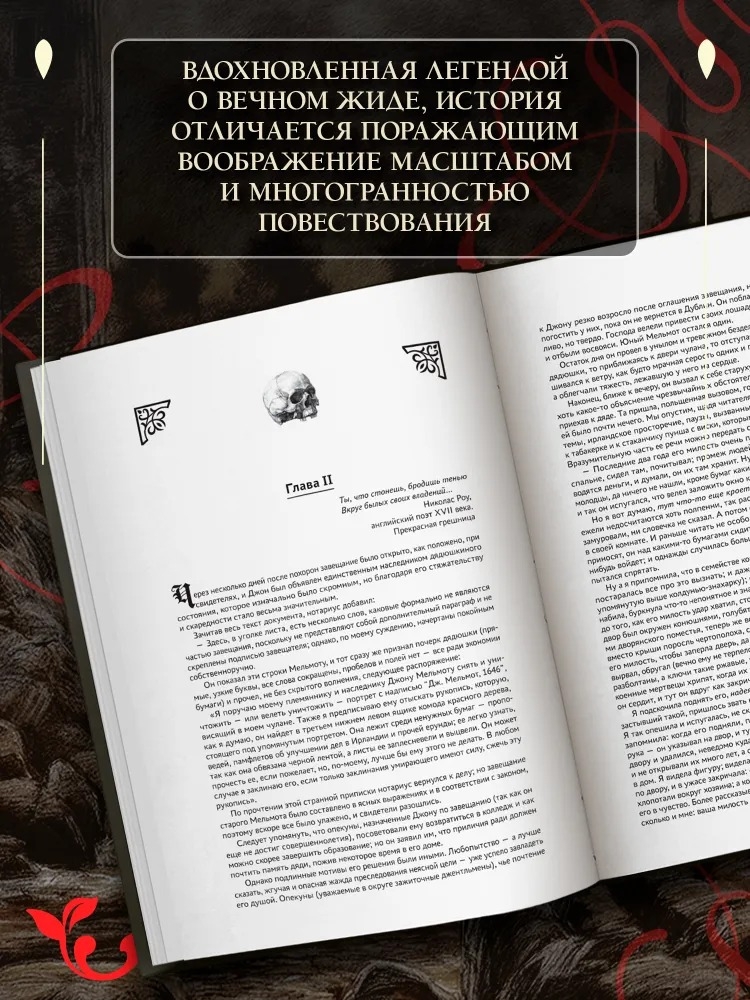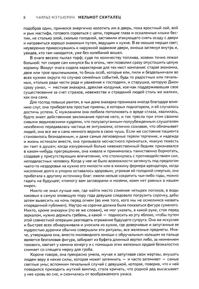 "Мельмот Скиталец" – бесспорный литературный памятник своей эпохи и одно из самых значимых произведений готического жанра. Хрестоматийная история о человеке, продавшем душу дьяволу за бессмертие и обреченном веками скитаться по земле в поисках того, кому можно будет передать свой дар и свое проклятие, несомненно, вдохновлена легендой о Вечном жиде и отличается поражающим воображение масштабом и многогранностью повествования.