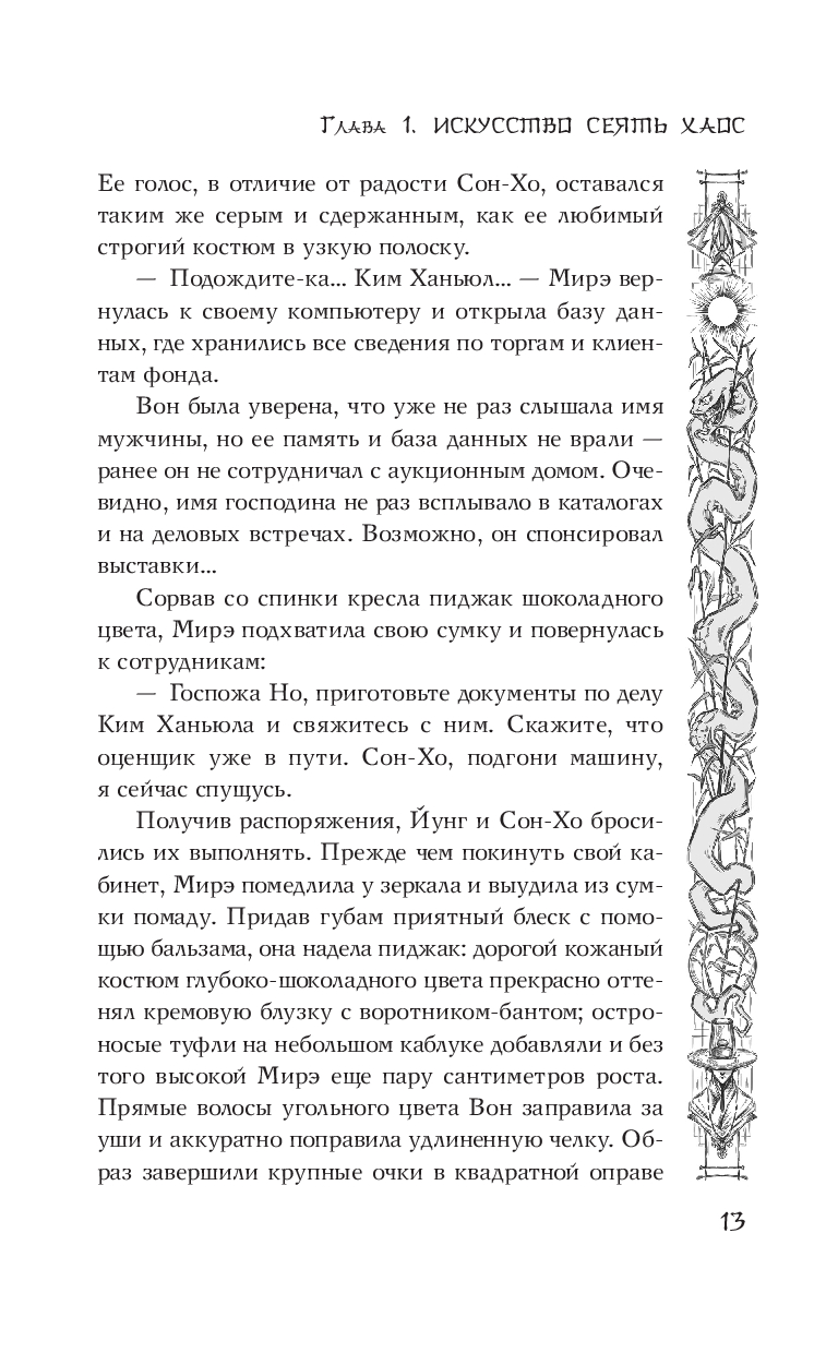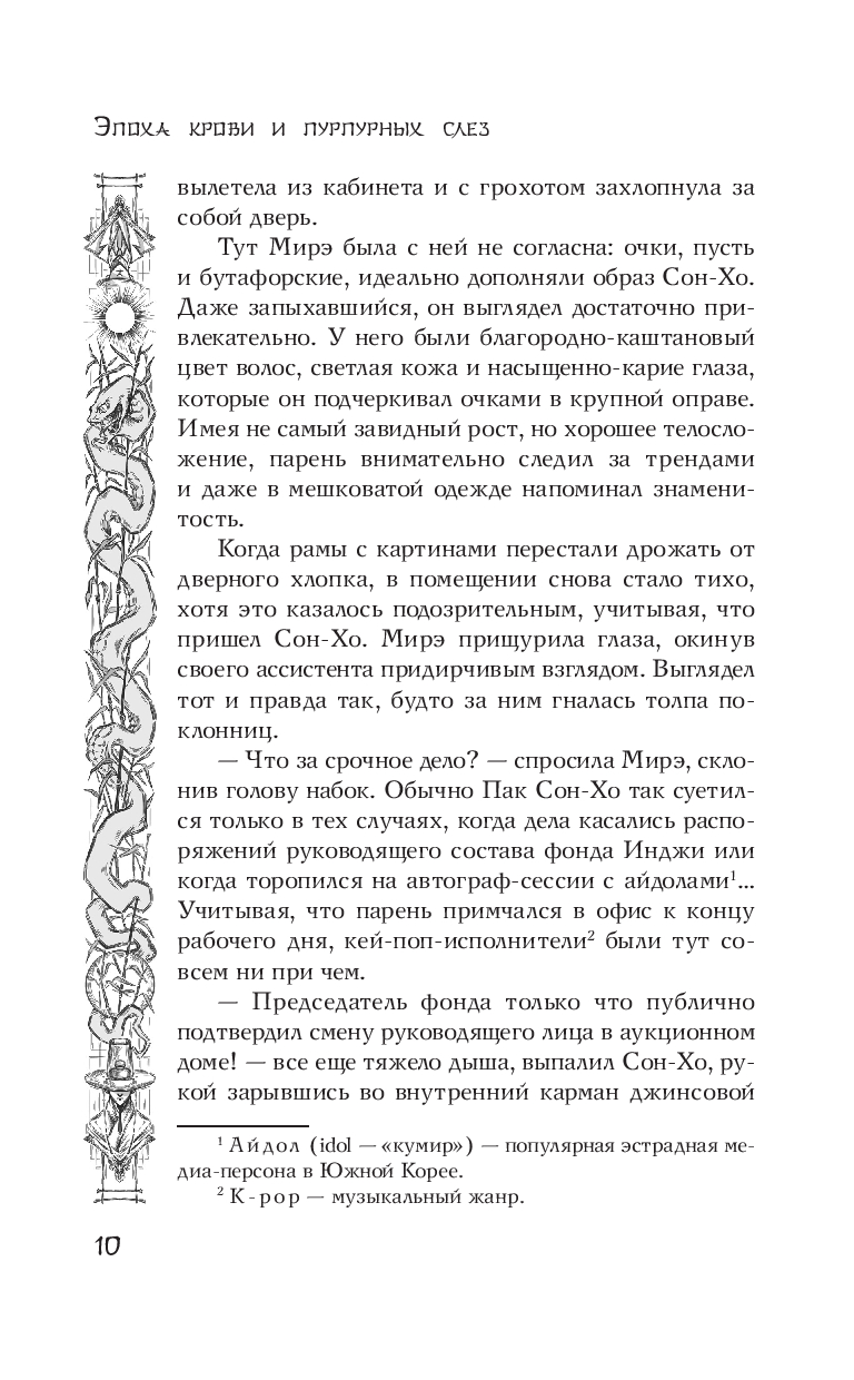 Эта книга пропитана мифологией и настояна на корейских дорамах. Словно пробовать на вкус азиатскую сладость с терпким вкусом васаби: интересно, необычно, непонятно. Перед нами история девушки, которая старается вырвать кресло директора в гонке на выбывание. Она сталкивается с потерянным парнем, но воспринимает его всерьёз только после нападения жнеца. Теперь ей предстоит разбираться с Хранителем, который почему-то может заключать договора, с бандитом, овладевшем ценной книгой, и тварями, что почему-то стараются убить главную героиню. Поначалу книга казалась мне очень странной, но стоило мозгам перестроиться на рельсы дорамы, как перед глазами просто визуализировались картинки. Язык повествования текущий, приятный, атмосферный. Я с удовольствием почитаю что-то ещё от этого автора. История действительно словно сошла с экранов на бумагу да так и застыла) Здесь чистая Корея без примисей. Словно оказался не в туристической части города, а в повседневных переулках: где-то плохо, где-то громко, где-то по-соседски. Здесь достаточно много описаний жестоких сцен. Так что если вам становится плохо от кишочков, то вам может не понравится. Читая книгу, я погрузилась в историю всем "телом". Мне безумно понравился слог. Сюжет, персонажи тоже хороши и уместны. Есть отсылки к прошлому и выводы в будущем. Ко всему прочему оформления страниц, арты и зарисовки комиксов не давали и шанса: это поглощает тебя. Советую ли я книгу? Определённо. Кому? Кто любит азиатщину, триллеры и мистику. Любовная линия здесь есть, она не лишена романтики, но она из "взрослого" периода, когда не удивляются пустой квартире после ночной интрижки. Кстати да. Была удивлена наличию постельной сцены) Почему-то это стало для меня большим сюрпризом, чем весь сюжет:) 4 из 5 звёзд