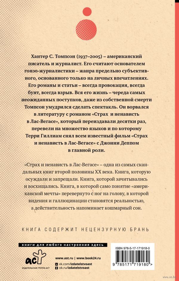 "Страх и ненависть в Лас-Вегасе" – одна из самых скандальных книг второй половины ХХ века. Книга, которую осуждали и запрещали. Книга, которой зачитывались и восхищались. Книга, в которой само понятие "американской мечты" перевернуто с ног на голову, в которой видения и галлюцинации становятся реальностью, а действительность напоминает кошмарный сон.